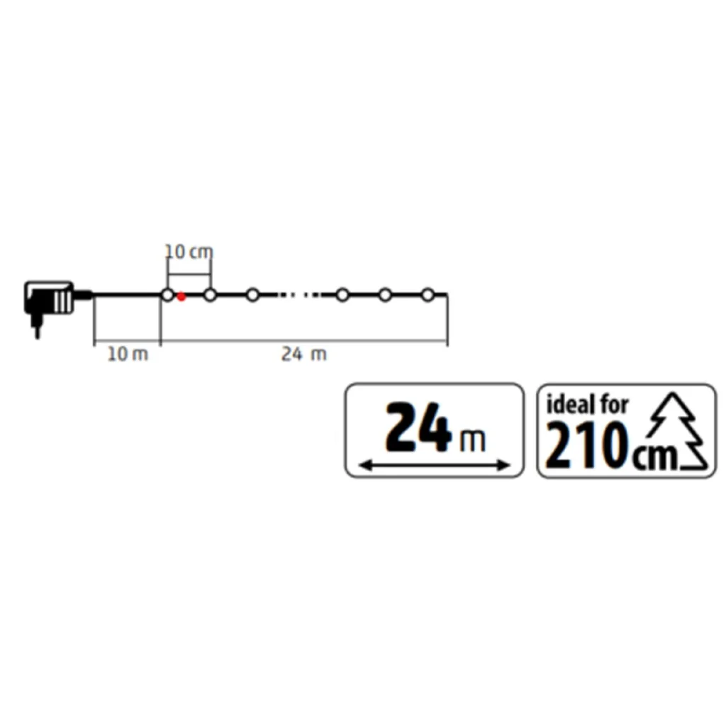A fényfüzér teljes hossza 23,9 méter, amelyen 240 darab melegfehér LED gondoskodik az egyenletes fényeloszlásról. A LED-ek 10 cm-es távolságban helyezkednek el egymástól, így a világítás sűrű, mégsem zavaró – ideális fa, erkélykorlát, kerítés vagy akár beltéri falak díszítésére is. A füzérhez tartozik egy 10 méter hosszú tápvezeték, amely lehetővé teszi a rugalmas és praktikus elhelyezést még távolabb eső csatlakozási pont esetén is.