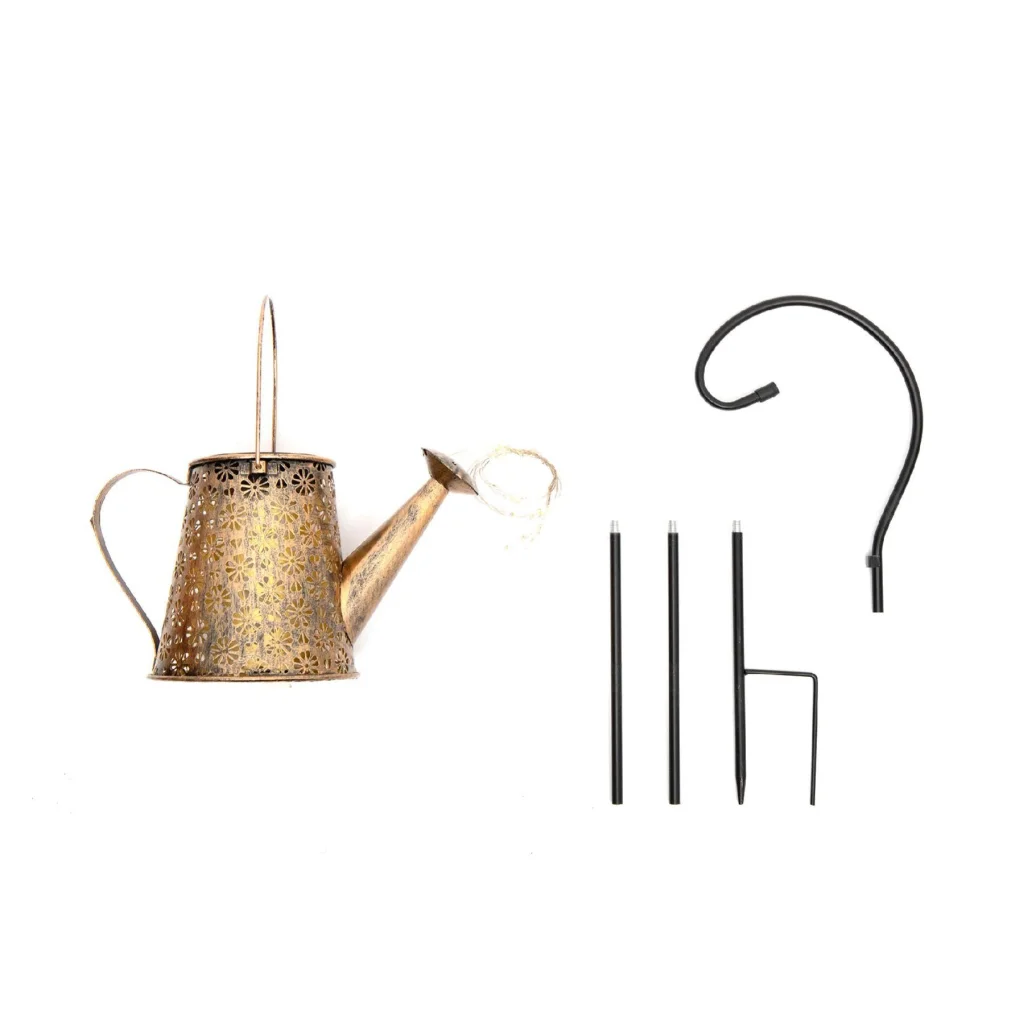 A lámpa egy melegfehér LED-et és 36 db melegfehér microLED-et tartalmaz, amelyek öntözést imitáló futó fényű LED efektet biztosítanak. Beépített, 1,2V AA (Ni-MH), 600mAh kapacitású akkumulátorral működik, amely napközben feltöltődik, este pedig automatikusan bekapcsol. A kanna mérete 28x14,5x16 cm, és egy 84 cm hosszú, leszúrható tartórúddal könnyedén rögzíthető a földbe. A fém anyag biztosítja a tartósságot és az elegáns megjelenést.