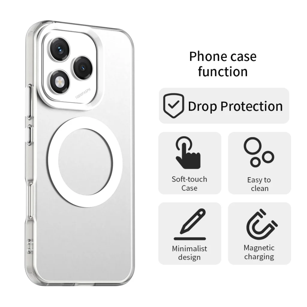 Ez a tok tökéletes egyensúlyt teremt az esztétika és a funkcionalitás között. A minimalista, átlátszó design lehetővé teszi, hogy Honor 400 Lite készüléke eredeti szépsége érvényesüljön, míg a beépített fehér MagSafe gyűrű elegáns és modern kiegészítőként funkcionál. Az "Ultimate Delicate Touch" technológia révén a tok felülete kivételesen selymes és kellemes tapintású, a precízen megmunkált, független gombok pedig tökéletes visszajelzést adnak. A tökéletes illeszkedés és a kényelmes fogás garantálja, hogy a telefon használata hosszú távon is élvezetes és fáradtságmentes marad.