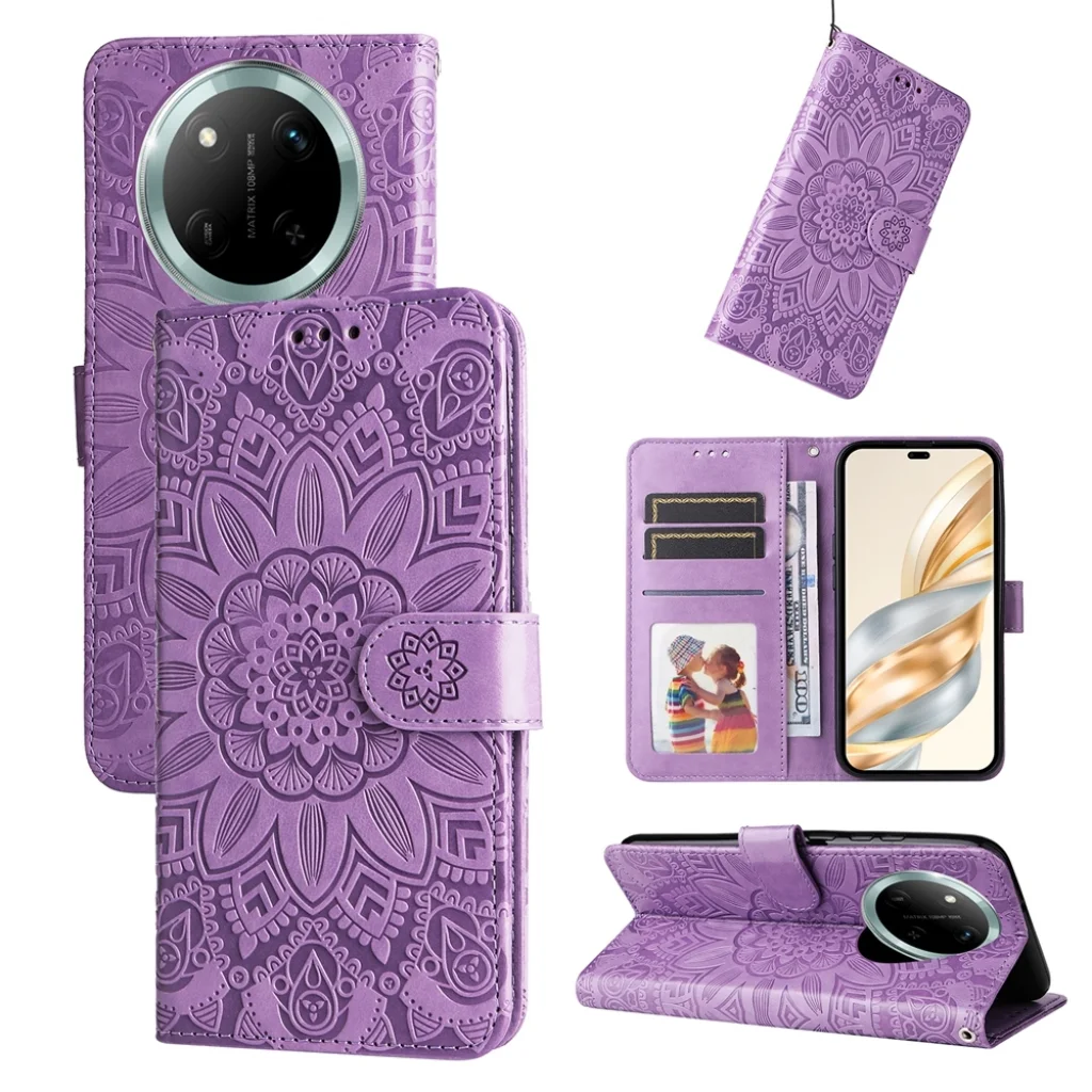 Honor Magic 7 Lite napraforgó mintás dombornyomott fliptok – lila