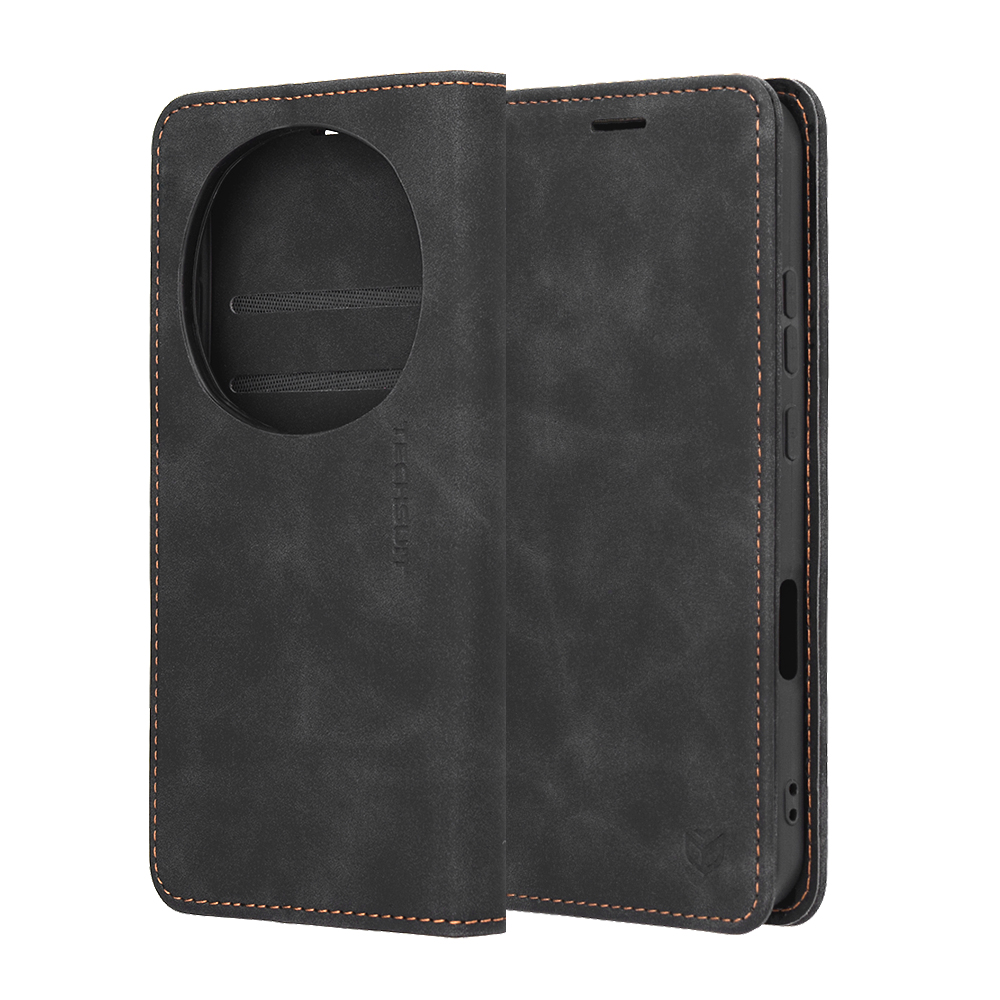 - Stílusos részletek: A mélyfekete külsőhöz tökéletesen passzoló, kontrasztos barna/narancssárga díszvarrás kiemeli a tok precíz kidolgozását és egyedi karakterét. A Techsuit márka logója diszkréten megjelenik a tok hátoldalán, jelezve a minőséget.