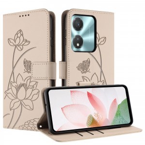 Honor X5c Plus – Lótusz mintás, dombornyomott műbőr telefontok, fliptok nyakpánttal, bézs