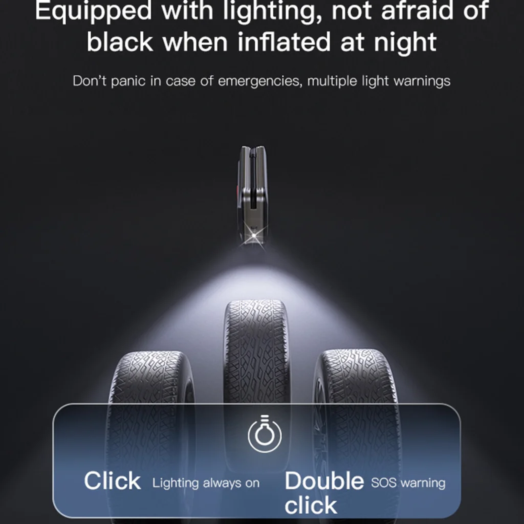- Beépített LED világítás: Ne aggódjon az éjszakai felfújás miatt! A beépített LED lámpa megvilágítja a munkaterületet, emellett SOS figyelmeztető fénnyel is rendelkezik vészhelyzet esetére (egyszeri kattintás a folyamatos világításért, dupla kattintás az SOS módhoz).