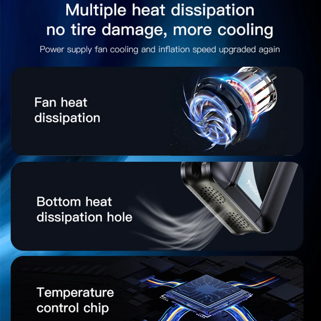 - Intelligens hőelvezetés: A pumpa többrétű hűtési rendszerrel rendelkezik, amely magában foglalja a ventilátoros hőelvezetést, az alsó szellőzőnyílásokat és egy hőmérséklet-szabályozó chipet. Ez megakadályozza a túlmelegedést és védi a gumiabroncsokat a károsodástól.