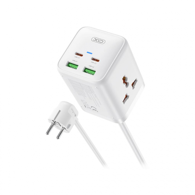 A XO Design WL24 egy modern, multifunkcionális hosszabbító, amelyet több eszköz egyidejű hatékony áramellátására és töltésére terveztek. Kompakt és elegáns formatervezéssel rendelkezik, amely két hagyományos hálózati aljzatot kombinál nagy teljesítményű USB-A és USB-C portokkal, összesen 65W teljesítményt biztosítva. Kompatibilis a gyors töltési protokollokkal, mint a PD3.0, QC3.0, FCP és PPS, így tökéletes okostelefonok, tabletek, laptopok és egyéb elektronikus eszközök töltésére. Tartós, kiváló minőségű anyagokból készült, az XO WL24 maximális biztonságot nyújt beépített védelemrendszereivel túlfeszültséggel, túlmelegedéssel és rövidzárlattal szemben. Az 1,5 méteres tápkábel rugalmasságot biztosít az elhelyezésben, míg a kompakt méret ideális választássá teszi otthoni, irodai vagy utazási használatra.