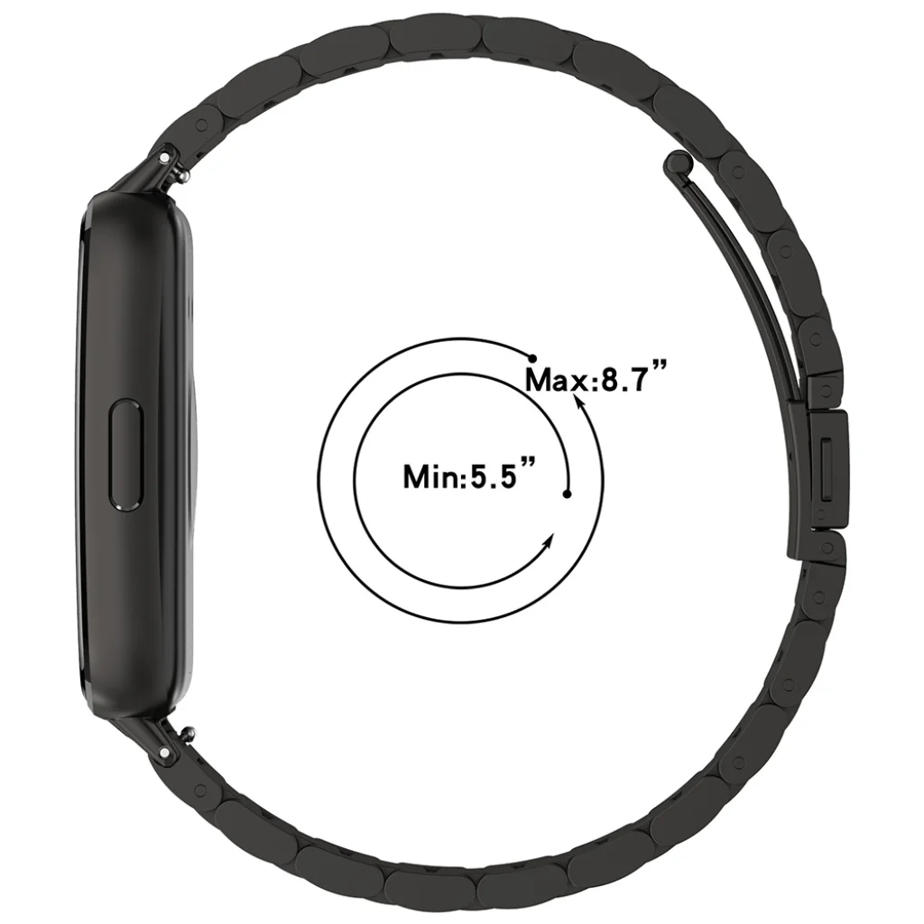 A szíj mérete a csuklóhoz igazítható, így stabil és kényelmes illeszkedést nyújt. A mellékelt termékképek alapján a szíj teljes hossza 178 mm, szélessége 20,8 mm, és körülbelül 5,5"–8,7" csuklómérethez igazítható, ezért többféle csuklómérethez is megfelelő lehet.