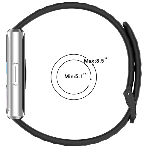 Az állítható csatos záródás stabil és biztonságos rögzítést nyújt, így a szíj természetesen simul a csuklóra. A képek alapján a szíj több méretben állítható, ezért széles csuklóméret-tartományhoz megfelelő, körülbelül 5.1"–8.5" csuklómérethez használható.