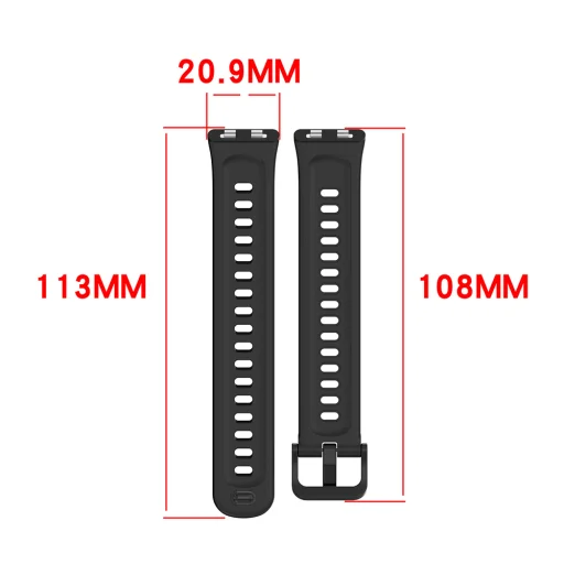 A termék kialakítása a képek alapján pontos illeszkedést biztosít a kompatibilis készülékhez, a szíj csatlakozási szélessége pedig 20,9 mm. A két szíjrész hossza megközelítőleg 113 mm és 108 mm, ami kényelmes beállítást tesz lehetővé a mindennapi használat során.