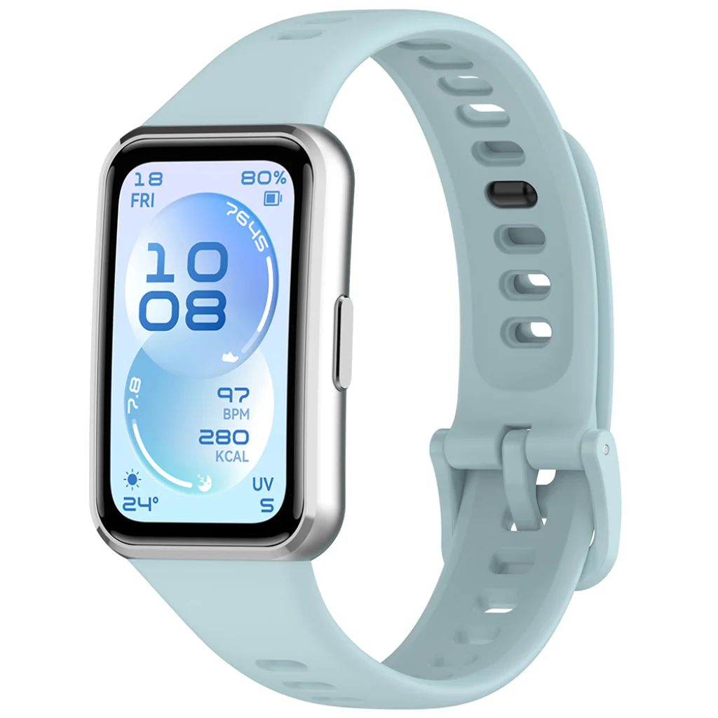 A szíj puha és rugalmas szilikonból készült, amely finoman illeszkedik a csuklóra, nem merev, nem kényelmetlen, és hosszabb viselés során is komfortos érzetet nyújt. Könnyű kialakítása miatt szinte észrevétlen marad a csuklón, így ideális azoknak is, akik egész nap hordják okoskarkötőjüket.