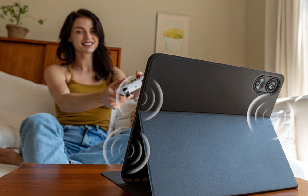 A legjobb hang és kép: A táblagép két oldalán szimmetrikusan elhelyezett négy hangszóró térhatású sztereó hangzást hoz létre a kivételes élményért filmnézés, zenehallgatás vagy játék közben. Az előlapon egy 8 MP-es kamera található, amely ideális videokonferenciákhoz, a hátlapon pedig egy 13 MP-es kamera, amely tökéletes fényképek készítéséhez vagy olyan eszközök használatához, mint például a HiPaint kép beillesztése.
