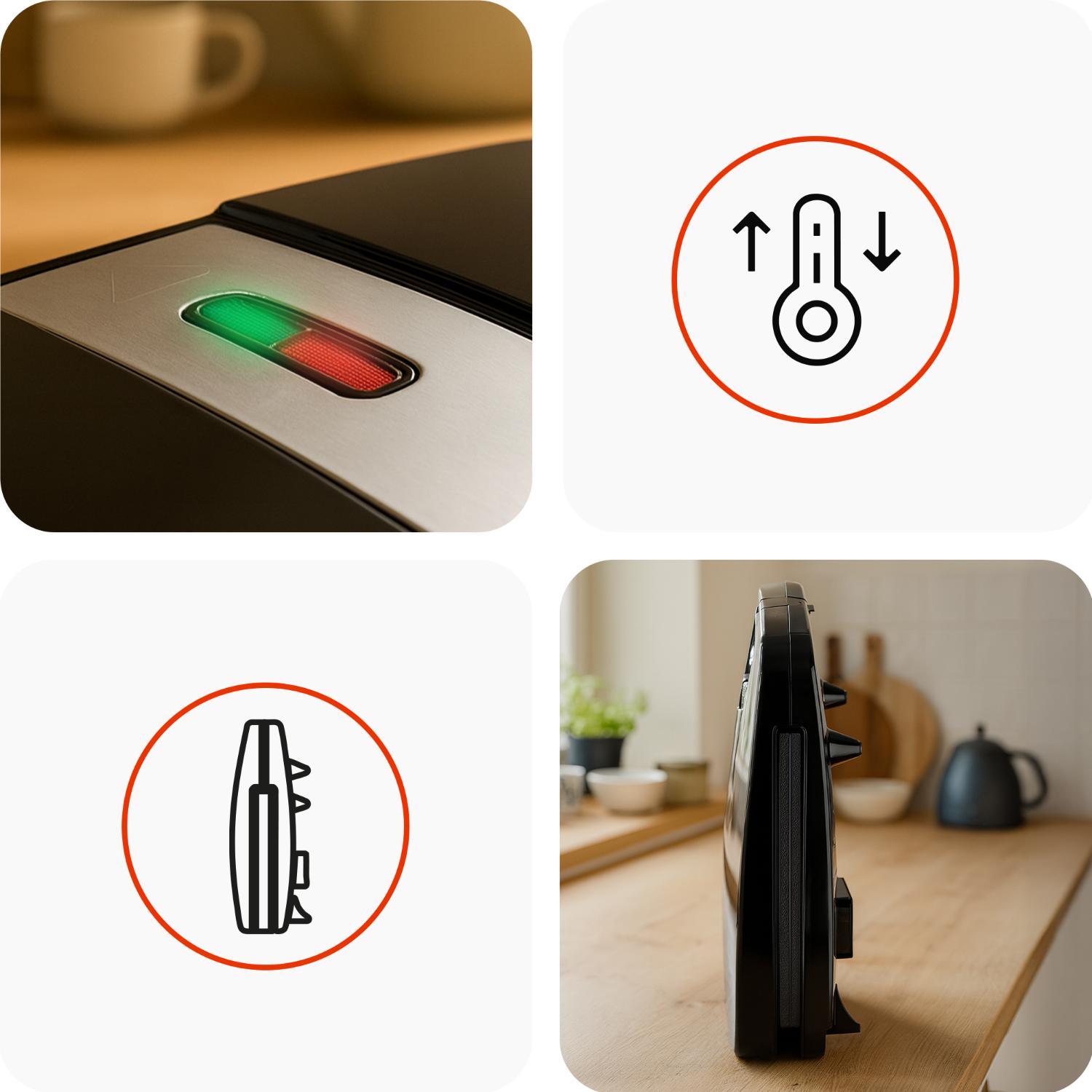 Fokozott biztonság mindenki számára: A felhasználói biztonság kiemelt fontosságú. A sütő hűvös tapintású fogantyúja biztosítja, hogy sose égesse meg magát a készülék nyitásakor vagy zárásakor. A stabilizáló zár pedig megakadályozza a véletlen kinyílást működés közben. A csúszásmentes lábak gondoskodnak a stabilitásról, míg a beépített túlmelegedés elleni védelem további nyugalmat biztosít. Az automatikus hőmérséklet-szabályozás és a praktikus jelzőfények (piros: fűtés, zöld: készenlét) jelzik a sütő aktuális állapotát, így mindig tudni fogja, mikor van a legideálisabb pillanat a szendvicsek elkészítésére.