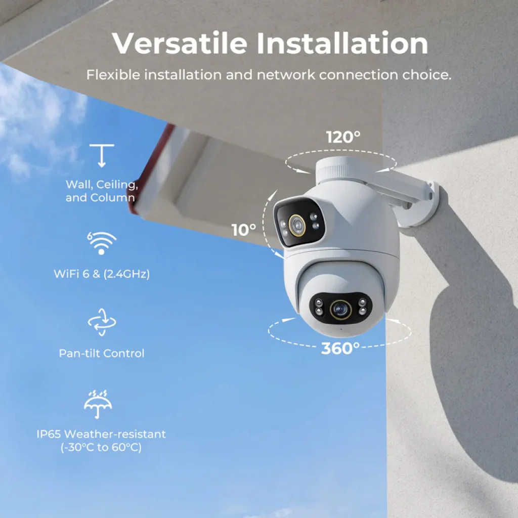 Az iMILAB EC6 Dual 3K+3K egy innovatív biztonsági kamera két lencsével és csúcstechnológiával, amelyek két 3K felbontású videofolyamot biztosítanak. Az alsó lencse automatikusan követi a mozgásokat 360 fokos szögben, míg a felső lencse fix marad, így folyamatos megfigyelést biztosít zavaró tényezők nélkül. Könnyen telepíthető, és kompatibilis a hangalapú asszisztensekkel, így tökéletes megoldás otthoni megfigyelésre. A kamera mesterséges intelligenciát használ a személyek, járművek és kerékpárok pontos felismerésére, csökkentve a téves riasztásokat. Kétirányú audió kapcsolatának köszönhetően valós időben kommunikálhat családtagokkal, kézbesítőkkel vagy látogatókkal. Okos és hatékony éjszakai látással rendelkezik, amely mozgásérzékeléskor teljes színmódra vált az energia megőrzése érdekében. Automatikus veszélyelhárító funkciói, mint a sziréna, villanó fény vagy előre felvett üzenetek használata, távolról is elriasztják a behatolókat. A testreszabható megfigyelési zónák és valós idejű hozzáférés lehetősége bárhonnan elérhető, a 360 fokos forgatás és 90 fokos dőlésszög vezérlése egyetlen alkalmazással történik. Az IP65-ös minősítésű kamera strapabíró, -30 és 60 Celsius fok között működik, eső és por ellen védett. Biztonságos helyi vagy felhő alapú tárolási lehetőségeket biztosít, és 24/7 folyamatos megfigyelést tesz lehetővé. Kompatibilis a Google Asszisztenssel és az Alexával, így hangutasításokkal is irányítható. A kamera a Xiaomi ökoszisztéma részeként közvetlen élő nézetet és felvétel visszajátszását kínálja telefonon keresztül. Tartozékai közé tartozik a felhasználói kézikönyv, rögzítő sablonok, csavar készlet és hálózati adapter.