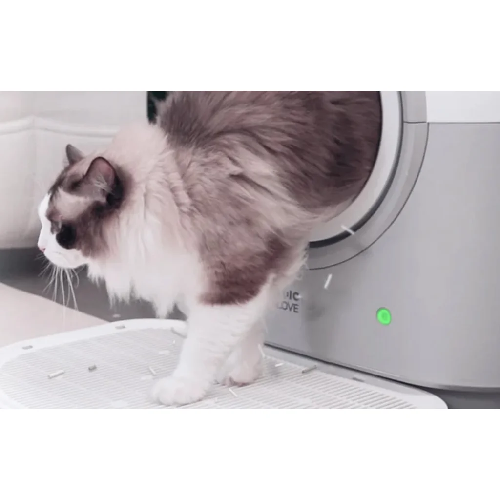 Könnyű tisztítás: Az alomtároló egyes elemei, beleértve a hulladéktárolót is, könnyen eltávolíthatók és tisztíthatók. A készülék alját nedves törlőkendővel törölheti át, hogy higiénikus körülményeket biztosítson macskája számára. A készlethez mellékelt praktikus alátét megakadályozza, hogy a szennyeződés a padlóra kerüljön, és felfogja a kiömlött almot, amely újra felhasználható, hozzájárulva a megtakarításhoz és megkönnyítve a rendben tartást.