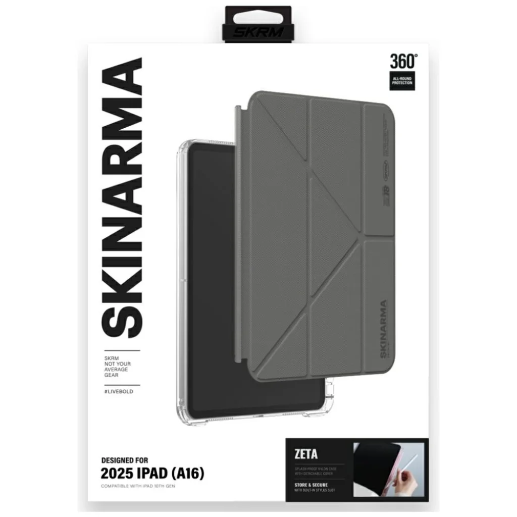 A Skinarma Zeta tok a modern design és a teljes funkcionalitás kombinációja, amely az iPad védelmére szolgál. Fröccsenésálló nylonból és átlátszó műanyagból készült. A tok 360°-os védelmet nyújt anélkül, hogy feladná a stílust. Finom geometriai domborítások és egyedi textúrája karakteres, figyelemfelkeltő megjelenést biztosít, amely kiemelkedik a szokványos megoldások közül.
