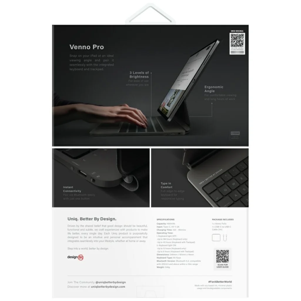 UNIQ Venno Pro Magnetic Smart Case billentyűzettel – a védelem, a funkcionalitás és az elegancia tökéletes kombinációja. Ez a tok optimális nézési szöget biztosít iPadjéhez, beépített billentyűzete és érintőpadja pedig zökkenőmentes interakciót tesz lehetővé. A Venno segítségével iPadje teljes értékű eszközzé válik munkára, alkotásra és szórakozásra.