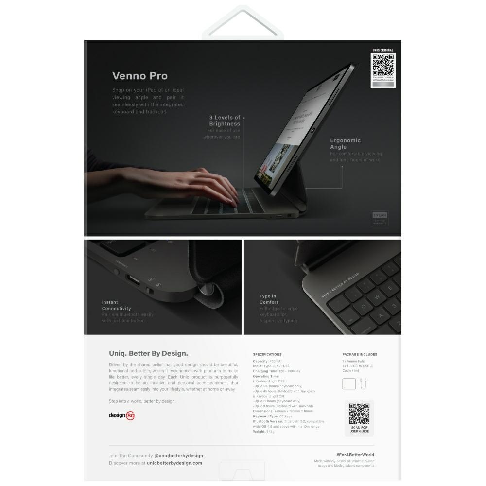 Fedezd fel a UNIQ Venno Pro Mágneses Okos Tokot Billentyűzettel - a védelem, funkcionalitás és elegancia tökéletes kombinációját. Ez a tok tökéletes betekintési szöget biztosít az iPad számára, és a beépített billentyűzet és trackpad sima interakciót tesz lehetővé. A Venno-val az iPad teljesértékű munka-, alkotás- és szórakoztató eszközzé válik.
