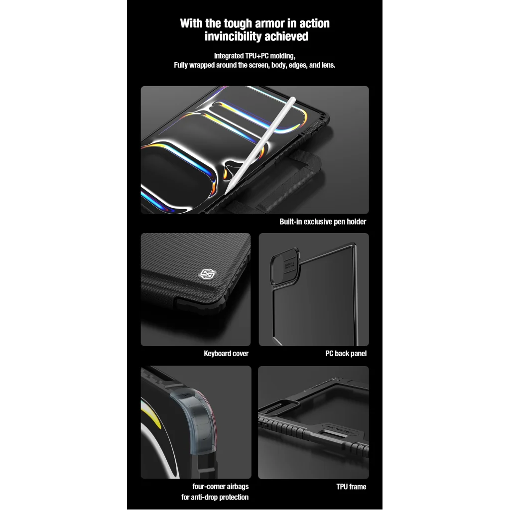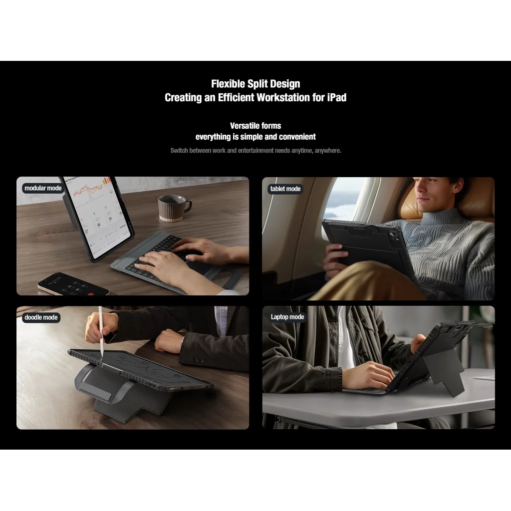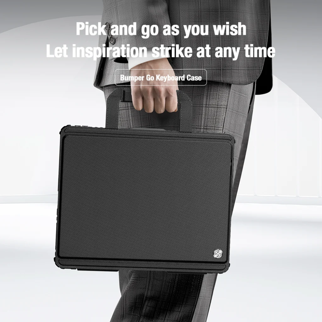A Nillkin Bumper GO Keyboard tok egy többfunkciós táblagép védőtok levehető háttérvilágítású billentyűzettel, Apple Pencil tartóval és folyamatosan állítható táblagép szöggel.