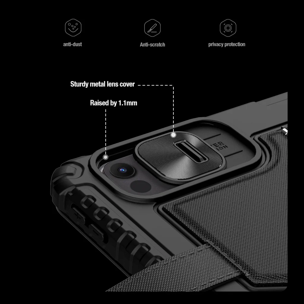 A védőtok TPU + PU anyagból áll, amely megvédi a táblagépet a sérülésektől. Emellett megerősített sarkokkal és csúszó kameravédő fedéllel is rendelkezik az extra védelemért.