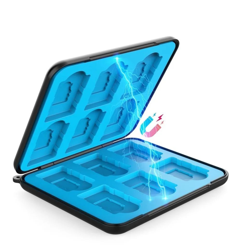 12 Nintendo Switch játékkártya és 12 memóriakártya tárolási kapacitása