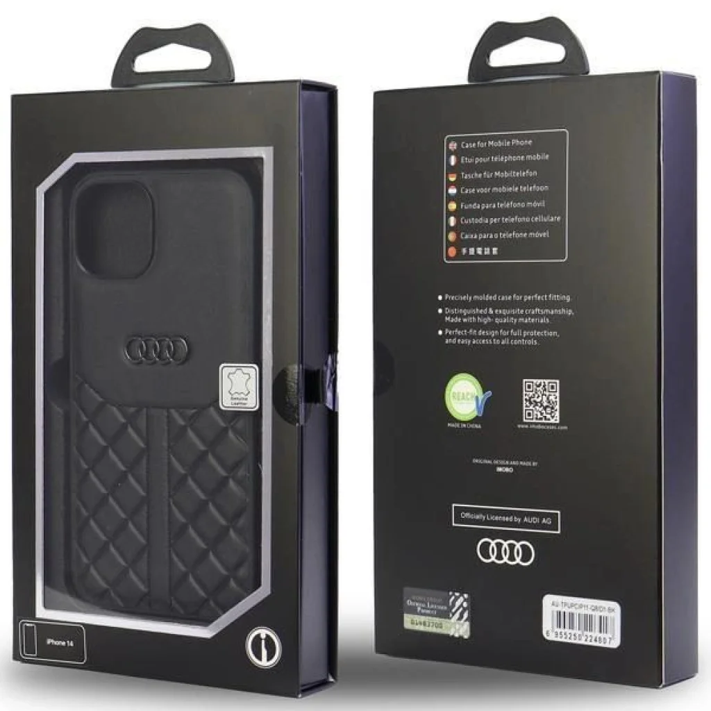Az Audi Genuine Leather sorozatú tokot a legapróbb részletekre is ügyelve és a telefonhoz tökéletesen illeszkedve készítették. A magja hőre lágyuló poliuretánból készült, amely ellenálló a sérülésekkel szemben, és könnyű összeszerelést biztosít. A borító felső rétege a legmagasabb minőségű természetes bőrrel van bevonva, ami nemcsak védelmet nyújt, hanem kellemes élményt is biztosít a használat során. A kollekciót egy dombornyomott geometrikus rombuszminta különbözteti meg, amely divatos megjelenést kölcsönöz neki.