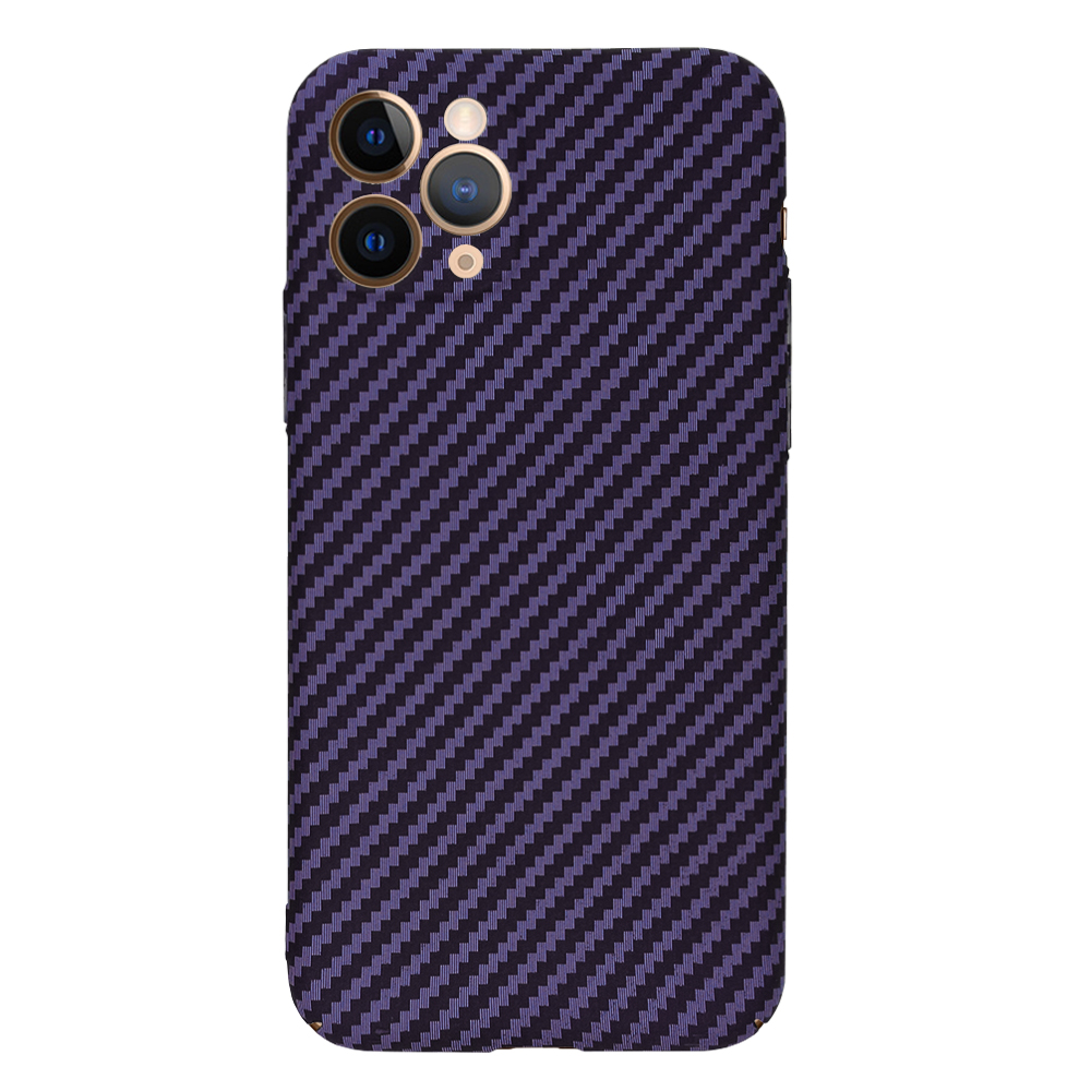 A tokot különleges, mélylila színű karbon mintázat jellemzi, amely modern és sportos eleganciát kölcsönöz készülékének. A precízen kidolgozott, finom textúrájú felület nem csak esztétikus, de kellemes tapintású is, hozzájárulva a kényelmes fogáshoz. Az iPhone 11 Pro lenyűgöző kamerarendszere körüli kivágások elegáns arany/bronz színű keretet kaptak, ami kifinomult részletet ad a toknak, tovább emelve annak prémium érzetét.
