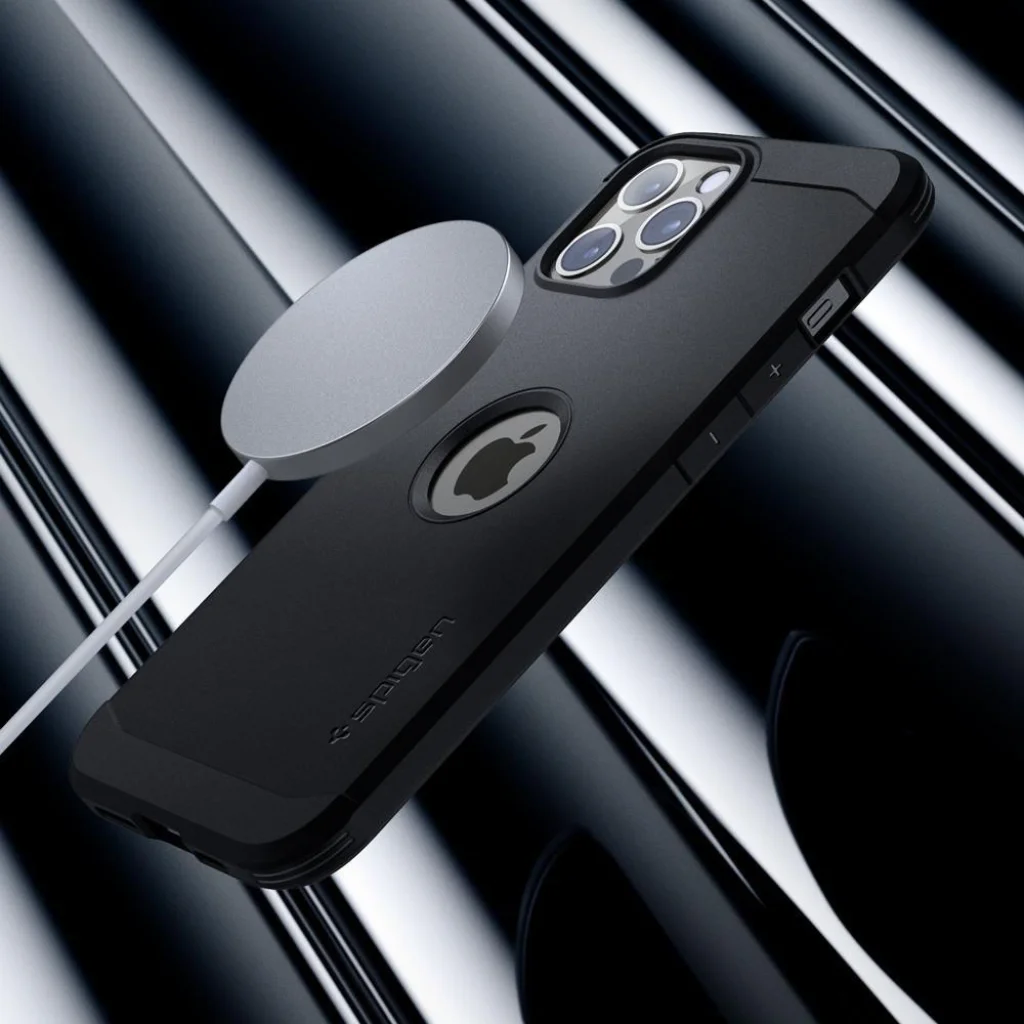 Viszonylag vékony védőtok. Kétrészes konstrukciója kopásálló hőre lágyuló műanyagból és polikarbonát merevítővázból készült. A termék ideális, teljesen működőképes, nem korlátozza a hozzáférést a külső portokhoz, és hatékonyan védi a készüléket a karcolásoktól és leesésektől. A tok a MagSafe vezeték nélküli technológiával kompatibilis gyűrűvel van felszerelve. A mágnesgyűrű biztosítja a maximális töltési hatékonyságot, valamint a MagSafe funkcióval rendelkező tartozékok gyors és egyszerű csatlakoztatását. A Rugged Armor alkalmassági teszteknek vetették alá, és megkapta a MIL STD 810G-516.6 tanúsítványt, ami azt jelenti, hogy 26-szor esett le 1.2 méteres magasságból. Minden Spigen termék kopásállóságát és pontos illeszkedését tesztelték, hogy kiváló minőségű tokot biztosítsanak.