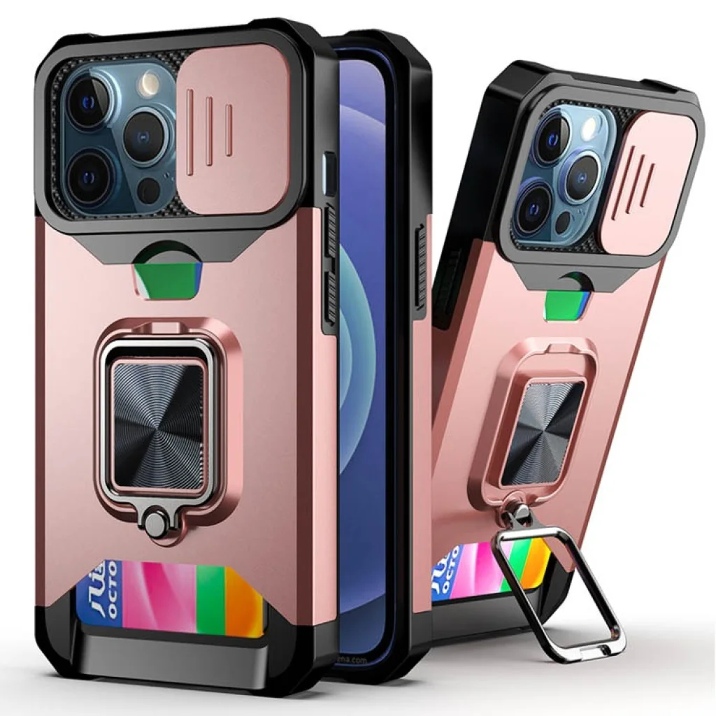 iPhone 13 mini Ring Armor tok kameralencse védővel, kihajtható támasszal, kártyatartóval rózsaszín (ip-13-mini-ring-armor-pink)