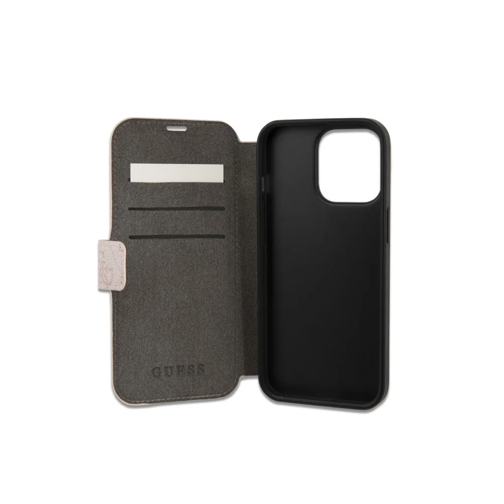 Válaszd az iPhone 13 Pro Max Guess PU 4G Metal Logo fliptokot rózsaszín színben, ha egy olyan tokot keresel, amely ötvözi a luxus megjelenést, a megbízható védelmet és a praktikus funkciókat!