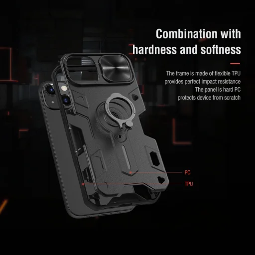Prémium minőségű anyaghasználattal készült, kemény kivitelű tok. Teljes körű védelmet biztosít a mindennapos használatból származó sérülésekkel szemben. Integrált kameralencse védelemmel. TPU és PC anyaghasználattal és fokozott védelemmel. Gyűrű alakú kitámasztóval.