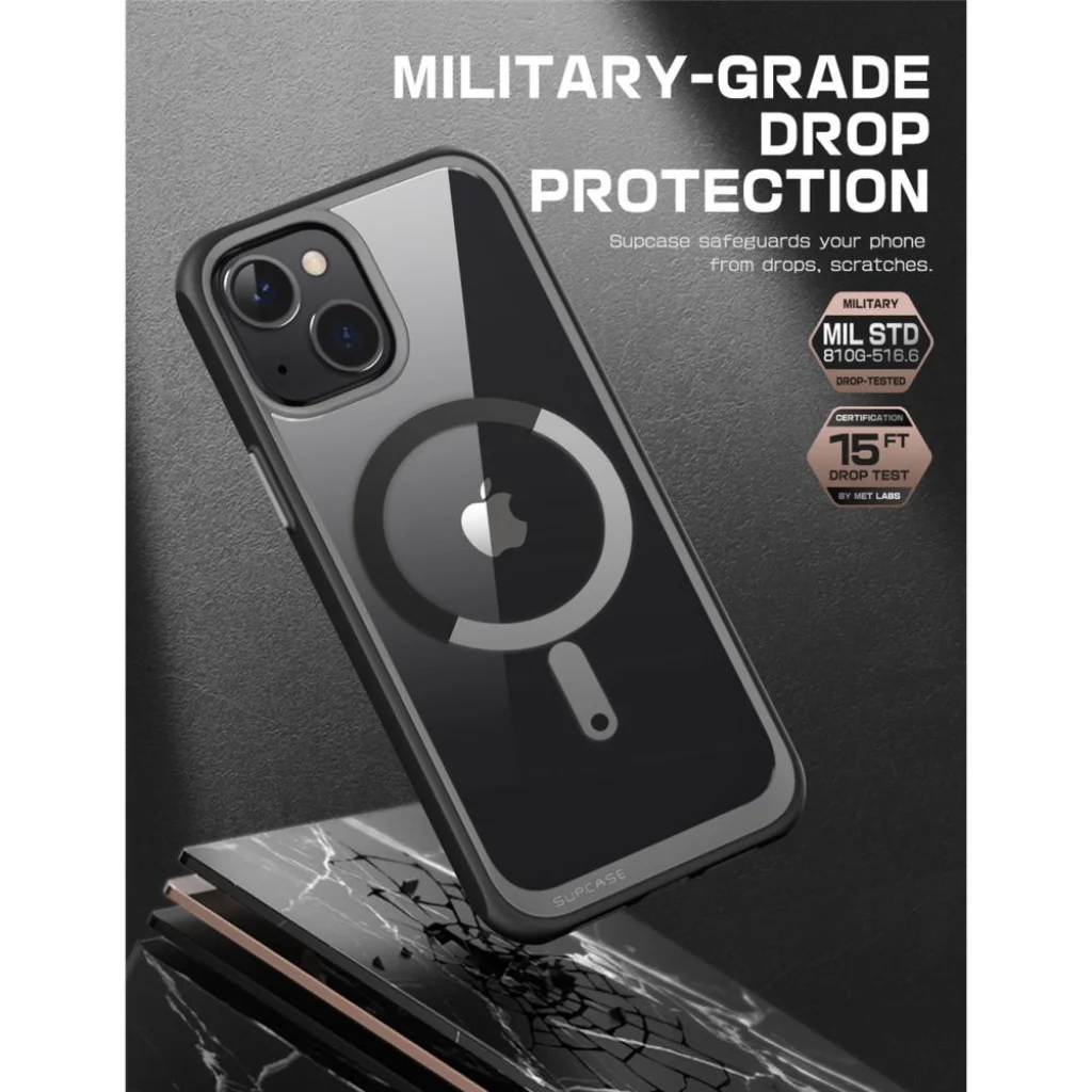 Tökéletesen szabott, hibrid kialakítás biztosítja a magas szintű védelmet. A polikarbonát bevonattal megerősített és edzett átlátszó hátlap tökéletesen megvédi a készüléket a karcolásoktól, és feltárja a készülék eredeti sziluettjét. A puha, hőre lágyuló, matt felületű keret javítja a tapadást, és a megerősített sarkok csillapítják az esést.A tok kissé megemelt formája a kamera és a képernyő körül védi a karcolásoktól azáltal, hogy a telefont közvetlenül a sík felület fölé mozgatja. Gombburkolatok és kivágások vannak a portokhoz. A mágneses gyűrű maximális töltési teljesítményt és gyors és egyszerű csatlakozást biztosít a MagSafe funkcióval rendelkező összes tartozékhoz. A tok a MagSafe vezeték nélküli technológiával kompatibilis gyűrűvel rendelkezik. A Supcase UB Mag egy olyan tok, amelyet alkalmassági teszteknek vetettek alá, 26-szor akár 1,2 m magasságból, így megkapta az amerikai MIL-STD 810G-516.6 katonai bizonyítványt.