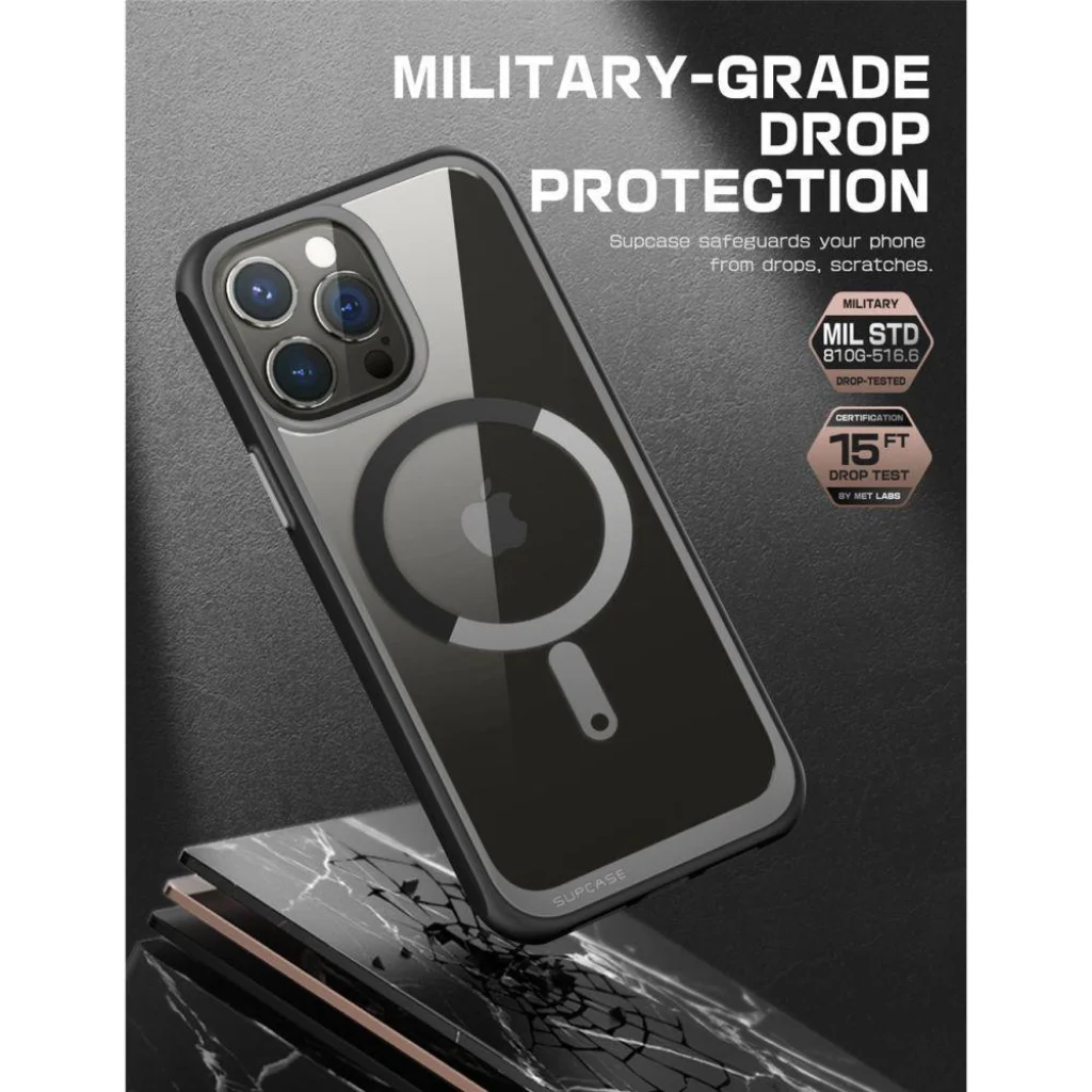 Tökéletesen szabott, hibrid kialakítás biztosítja a magas szintű védelmet. A polikarbonát bevonattal megerősített és edzett átlátszó hátlap tökéletesen megvédi a készüléket a karcolásoktól, és feltárja a készülék eredeti sziluettjét. A puha, hőre lágyuló, matt felületű keret javítja a tapadást, és a megerősített sarkok csillapítják az esést.A tok kissé megemelt formája a kamera és a képernyő körül védi a karcolásoktól azáltal, hogy a telefont közvetlenül a sík felület fölé mozgatja. Gombburkolatok és kivágások vannak a portokhoz. A mágneses gyűrű maximális töltési teljesítményt és gyors és egyszerű csatlakozást biztosít a MagSafe funkcióval rendelkező összes tartozékhoz. A tok a MagSafe vezeték nélküli technológiával kompatibilis gyűrűvel rendelkezik. A Supcase UB Mag egy olyan tok, amelyet alkalmassági teszteknek vetettek alá, 26-szor akár 1,2 m magasságból, így megkapta az amerikai MIL-STD 810G-516.6 katonai bizonyítványt.