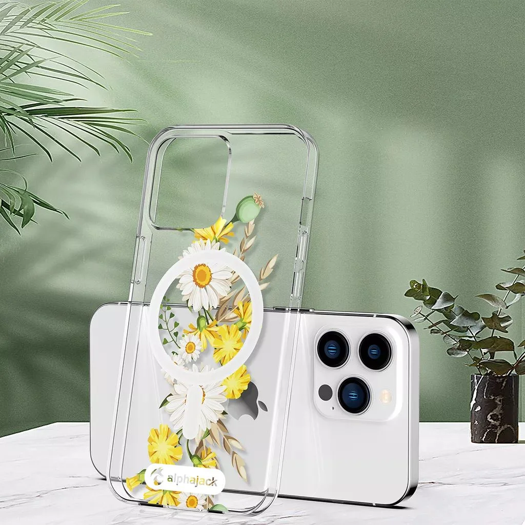IMD technológiával készült karc- és ütésálló virágmintás telefontok puha kerettel (TPU), dupla hátlapi réteggel (PC 1.8mm). A mintázata a két réteg között található (3D hatás), így nem kopik le, hosszútávon is szép élénk hatást ad. A beépített gyűrűnek köszönhetően kompatibilis a MagSafe kiegészítőkkel. A kameránál és a kijelzőnél a keret emelt, így plusz védelmet biztosít. Jó tapintású, csúszásgátlós felülettel ellátott tok, az összes gomb és csatlakozó tökéletesen használható, a kivágások precízek. A terméket prémium mágneses ajándékdobozban szállítjuk. A csomagban megtalálható még egy nedves törlőkendő, illetve egy száraz mikroszálas törlőkendő is, így biztosan por- és zsírmentesen helyezheti el készülékét ebbe a gyönyörű virágmintás tokba. A tokon kettő védőfólia is található, belső kék színű a MagSafe gyűrűnél, illetve egy külső áttetsző. A használat előtte távolítsuk el a védőfóliákat.
