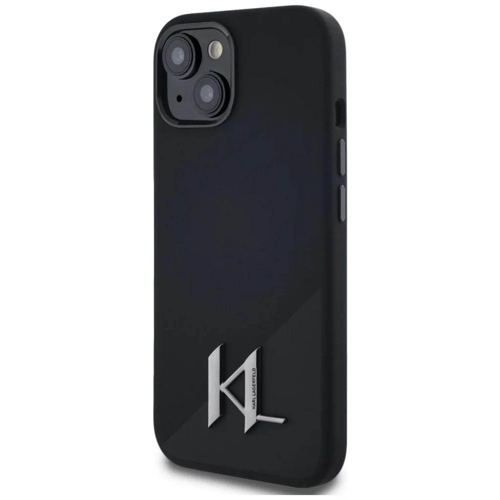 iPhone 15-höz MagSafe kompatibilis KARL LAGERFELD fekete szilikon tok (Kezdeti Fém Logó) KLHMP15SSCMKMPCK