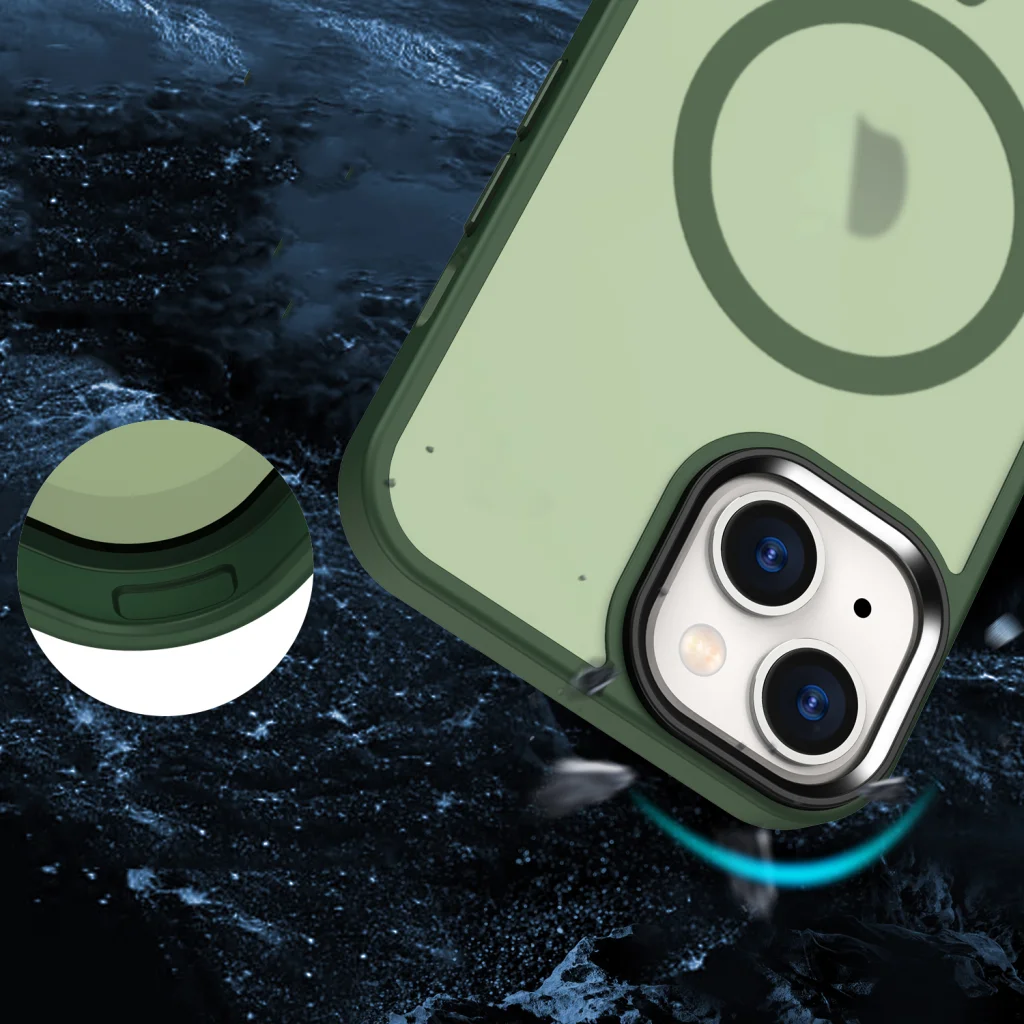 iPhone 15 Plus MagSafe-kompatibilis áttetsző matt tok sötétzöld Alphajack