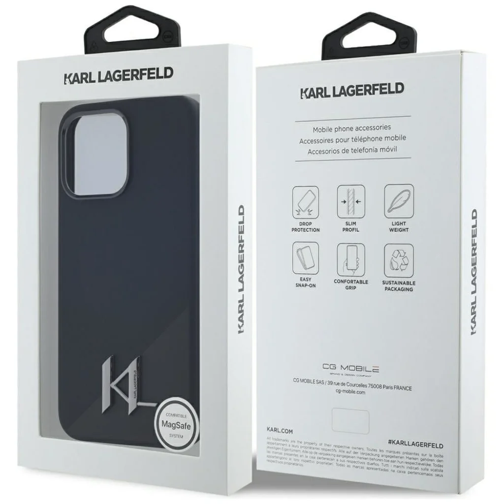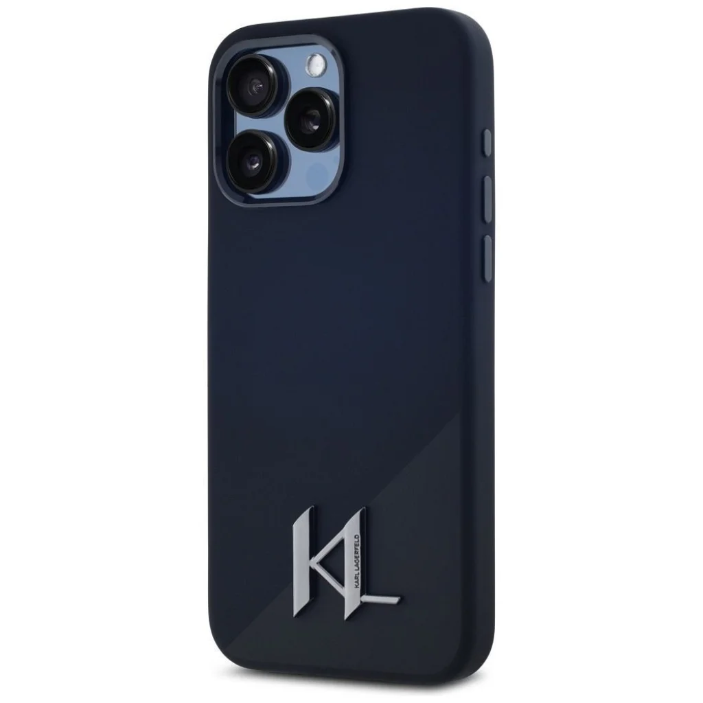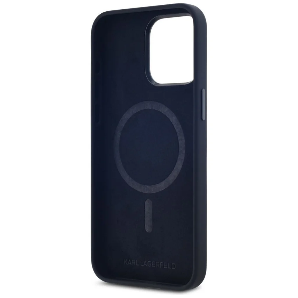 iPhone 15 Pro fekete KARL LAGERFELD Szilikon Kezdőbetűs Fém Logó tok, MagSafe kompatibilis KLHMP15LSCMKMPCK