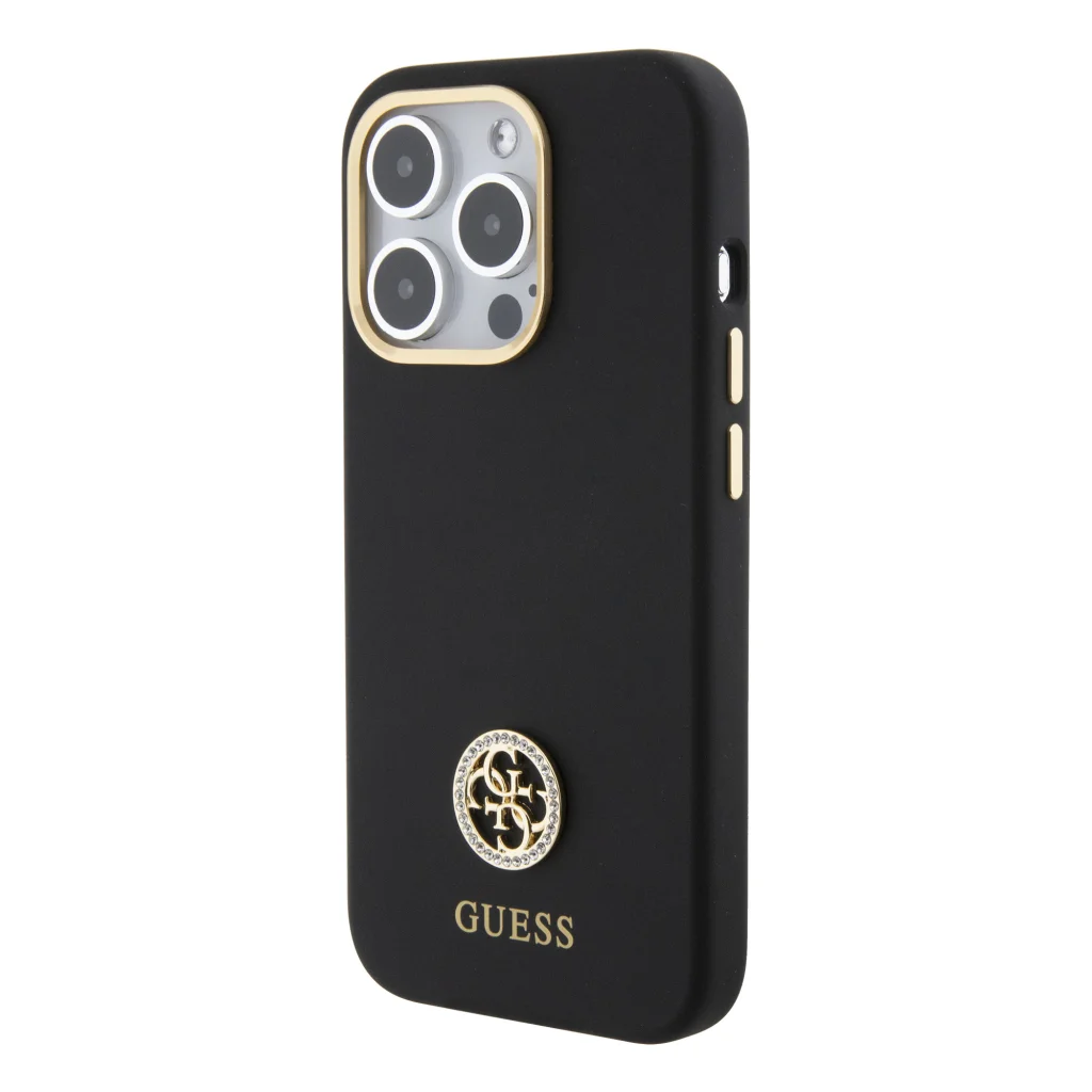 iPhone 15 Pro Guess Liquid Silicone 4G Strass Metal Logo tok fekete (GUHCP15LM4DGPK)