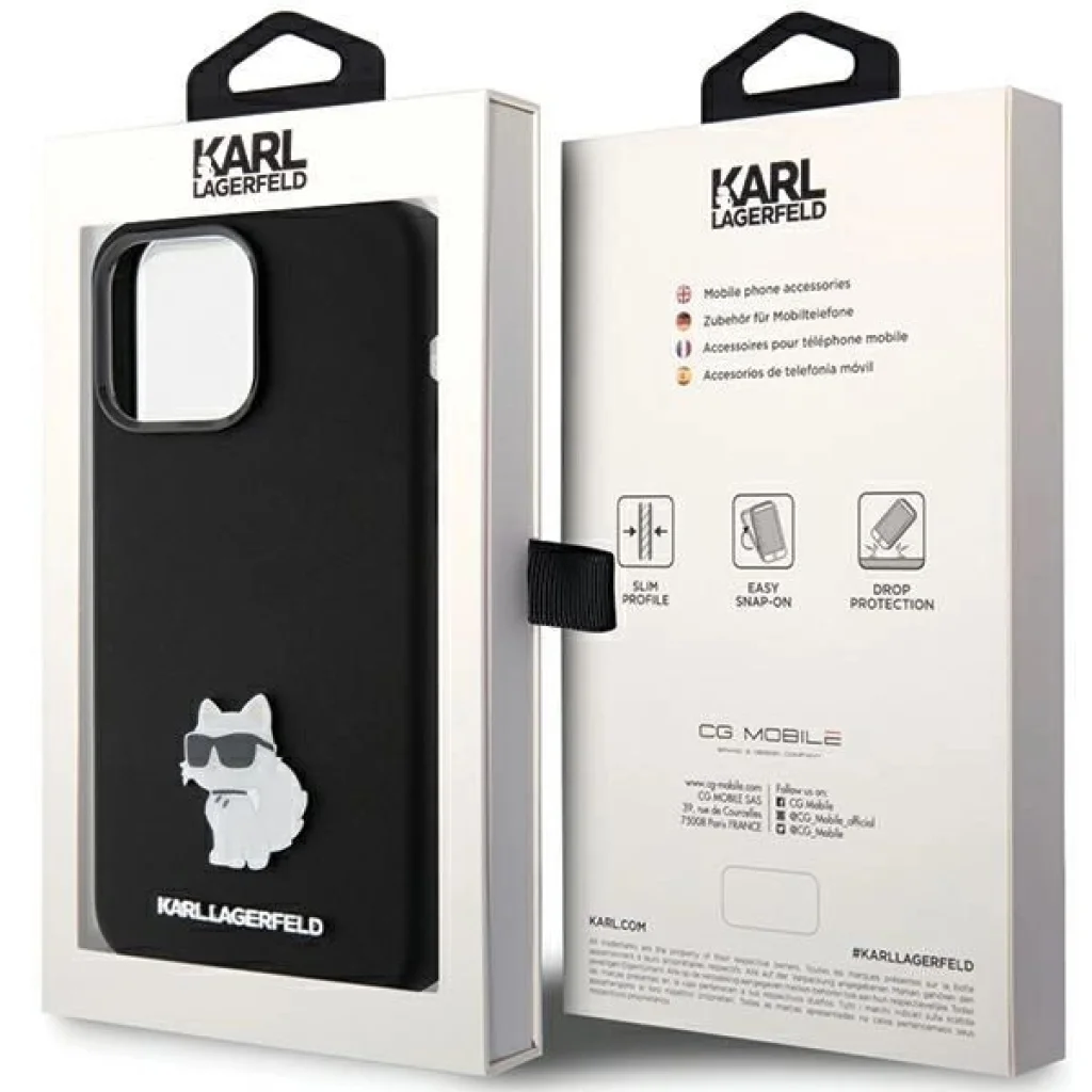 A védőtokok sorozatát egy nagy, háromdimenziós fém folt díszíti, amely az excentrikus tervező imádott macskáját, az aranyos Choupette-et ábrázolja. Az egész egy Karl Lagerfeld logós fém lemezzel van kiegészítve, ami igazolja a híres márka kiváló minőségét és hitelességét.