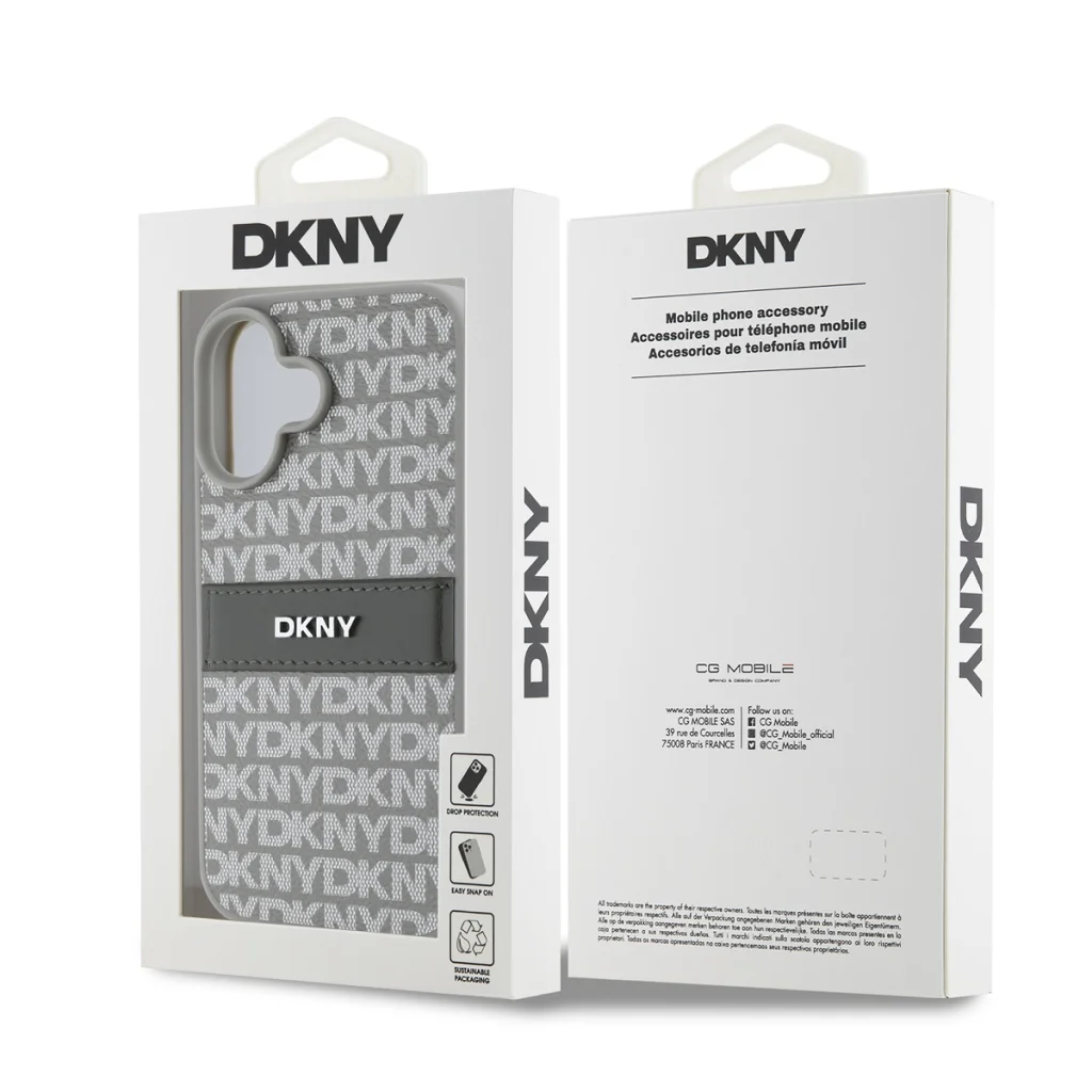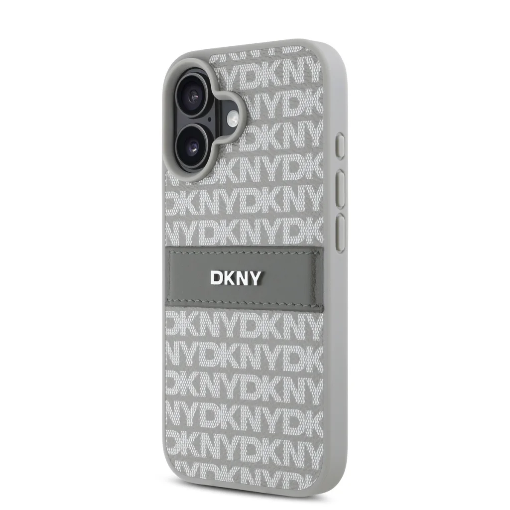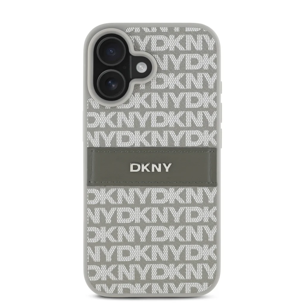 A telefontok kialakítása elegáns és modern esztétikát képvisel, a hátlapon ismétlődő "DKNY" logó mintázattal és egy merész csíkkal, amelyen az ikonikus logó is megjelenik.
