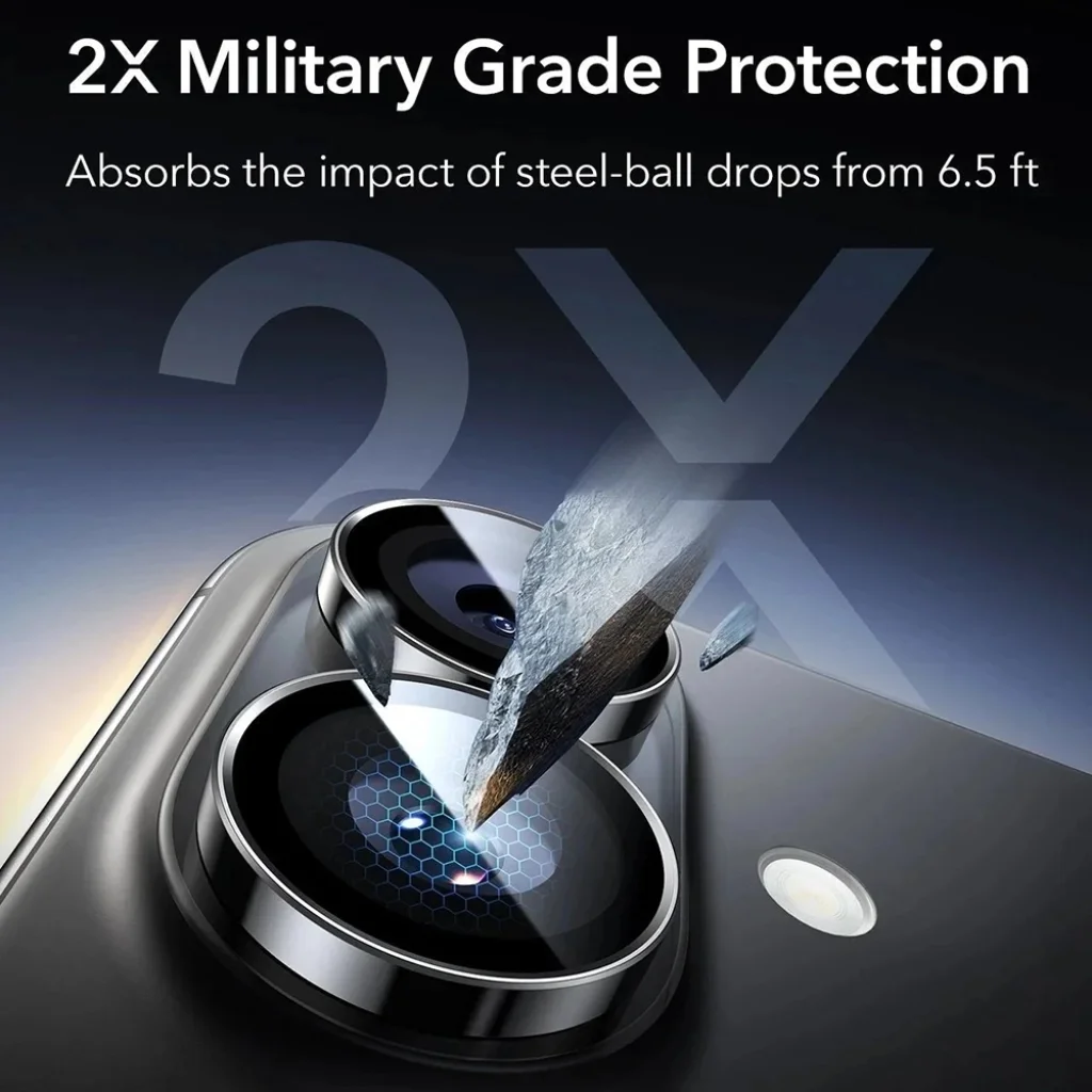 Az ESR Armorite lencsevédőket úgy tervezték, hogy ellenálljanak a legkeményebb kihívásoknak is. 2X katonai minőségű védelemmel rendelkeznek, ami azt jelenti, hogy képesek elnyelni az akár 2 méteres (6,5 láb) magasságból leeső acélgolyók ütését. A lencsék körül található megemelt szélvédelem tovább csökkenti a törés kockázatát, akár 80%-kal is, így telefonja kamerái biztonságban vannak a véletlen esések és ütések ellen.