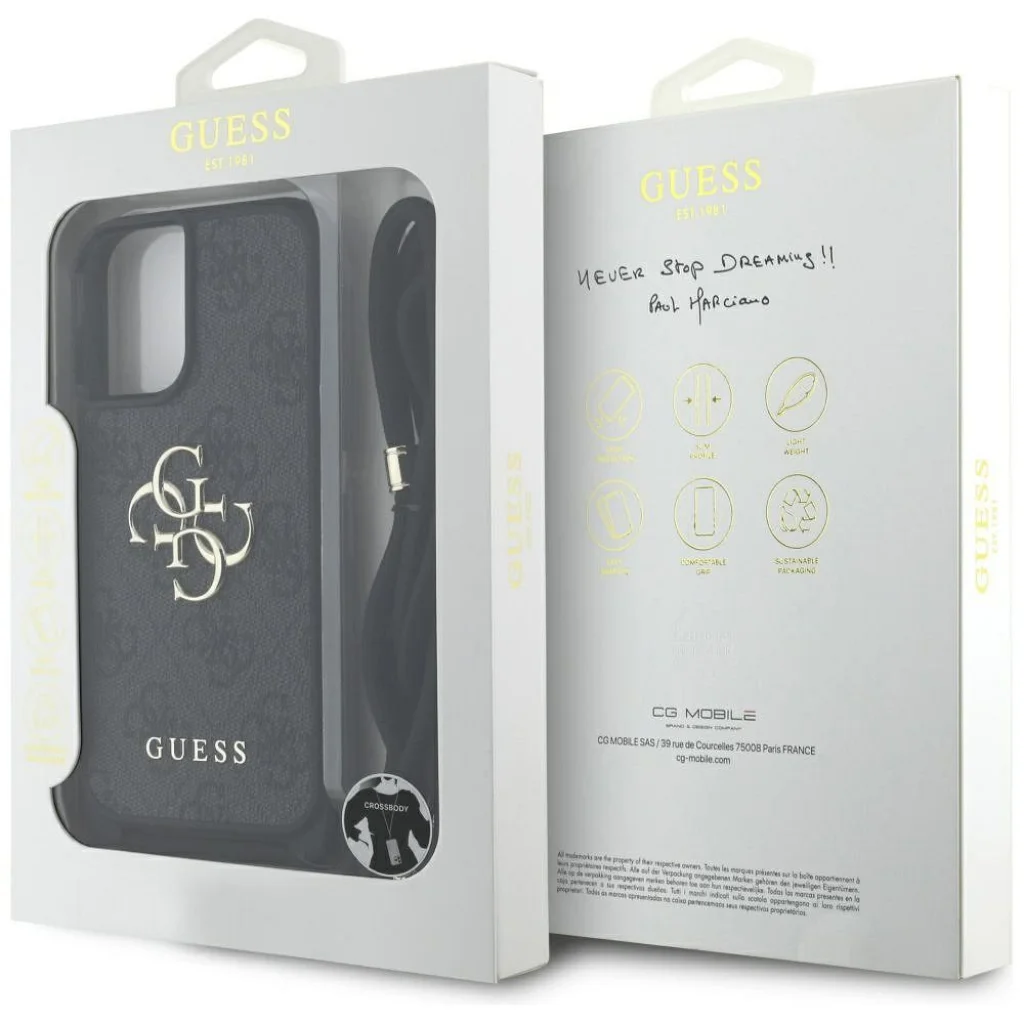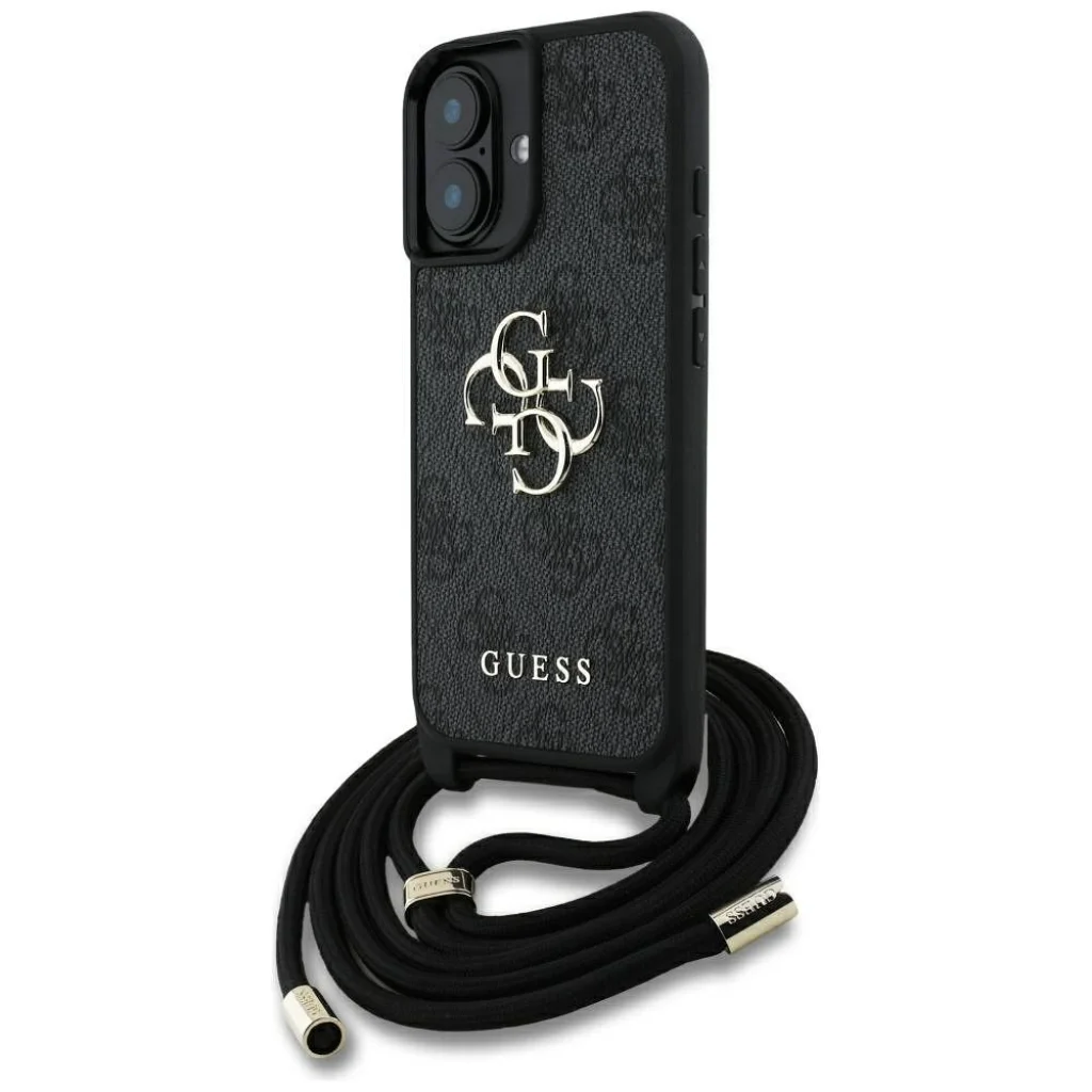 iPhone 16 Plus fekete GUESS tok GUHCP16MP4GMGCRK (CBDY PU 4G Nagy Logó Zsinórral)