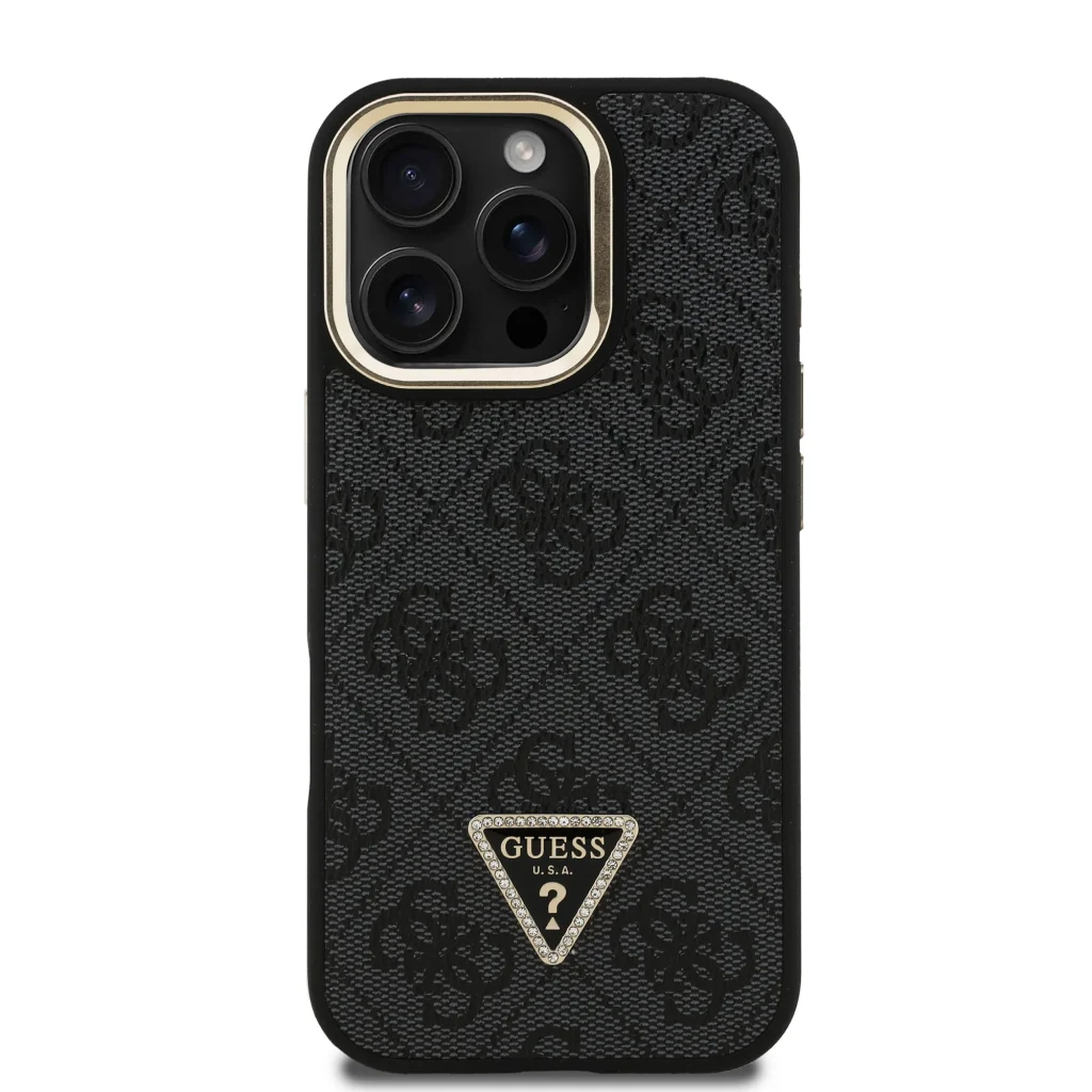 A prémium Guess PU 4G Strass Triangle Logo Állvány Kamera Keret hátlap elegáns, jellegzetes 4G mintázattal rendelkezik, amelyet a GUESS háromszög logó egészít ki.