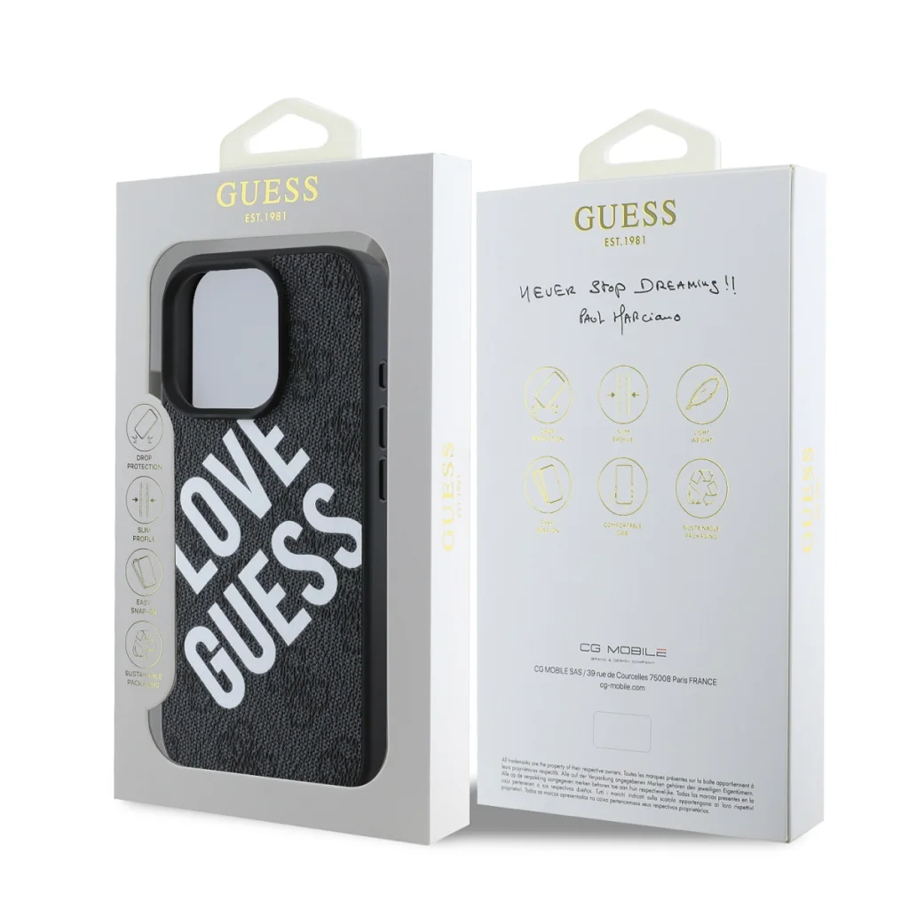 A Guess "4G" elegáns nyomat és a merész "Love Guess" felirat nemcsak luxus megjelenést kölcsönöz, hanem fantáziadús megoldást is kínál.