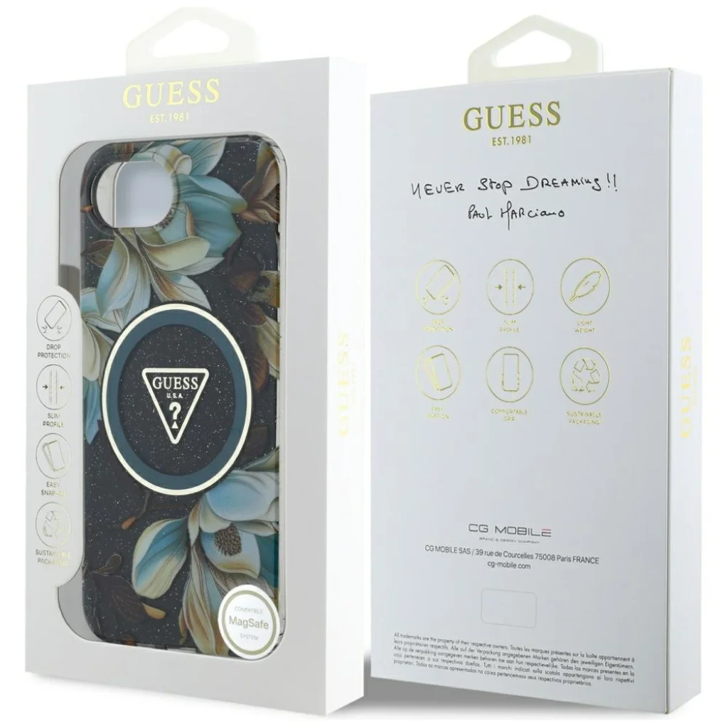 iPhone 16e Fekete Guess IML Fém Csillámvirágok Háromszög MagSafe tok (GUHMPSE4HFLPEDK)