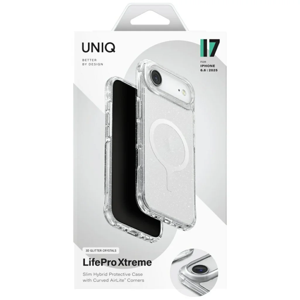 Uniq LifePro Xtreme Magclick töltőtok A Uniq egy olyan márka, amely az eleganciát, a funkcionalitást és a modern technológiákat kombinálja mobiltelefon-kiegészítők létrehozásában. A Uniq termékei precíz kidolgozásukkal, kiváló minőségű anyaghasználattal és a részletekre való odafigyeléssel tűnnek ki. Nemcsak kivételes védelmet kínálnak, hanem egy dizájnos megjelenést is, amely kiegészíti a modern készülékek esztétikáját. Tokjaik és kiegészítőik a stílus és a megbízhatóság tökéletes kombinációját jelentik, biztosítva a legmagasabb szintű biztonságot. PONTOS ILLESZKEDÉS ÉS TELJES FUNKCIONALITÁS A tok a modern felhasználók kényelmét szem előtt tartva készült, a funkcionalitást kivételes ergonómiával ötvözve. Ultra vékony kialakítása keskenyen tartja a telefont és kényelmes fogású. Az egyszerű összeszerelési és szétszerelési folyamatnak köszönhetően a tok könnyen használható, miközben teljes hozzáférést biztosít az összes porthoz és gombhoz, lehetővé téve a készülék kényelmes használatát. KIVÁLÓ MINŐSÉGŰ ANYAGOK A Uniq LifePro Xtreme Magclick töltőtok kiváló minőségű anyagokból készült, amelyek kiváló védelmet nyújtanak a telefon számára. A polikarbonát hátlap megvédi a készülék hátulját a karcolásoktól. Az enyhén megemelt élek a képernyő és a kamera lencséje körül megvédik a telefont a karcolásoktól, míg a rugalmas és puha oldalak gyors és könnyű telepítést tesznek lehetővé. 4-pontos ütéscsillapító erősítés védi a közvetlen képernyő leeséses ütésektől. Vezeték nélkül töltheted a telefonodat! A tok mágneses gyűrűvel rendelkezik, amely kompatibilis a MagClick induktív töltőkkel, biztosítva a gyors és egyszerű töltést. A beépített mágnesek tökéletesen illeszkednek a felhasználó telefonjához és erős kapcsolatot biztosítanak a készülék és a töltő között. Technikai adatok Márka: Uniq Kollekció: LifePro Xtreme Magclick Charging Típus: Keménytok Anyag: TPU / PC Szín: Átlátszó / csillogó Kompatibilitás: iPhone 17 Air
