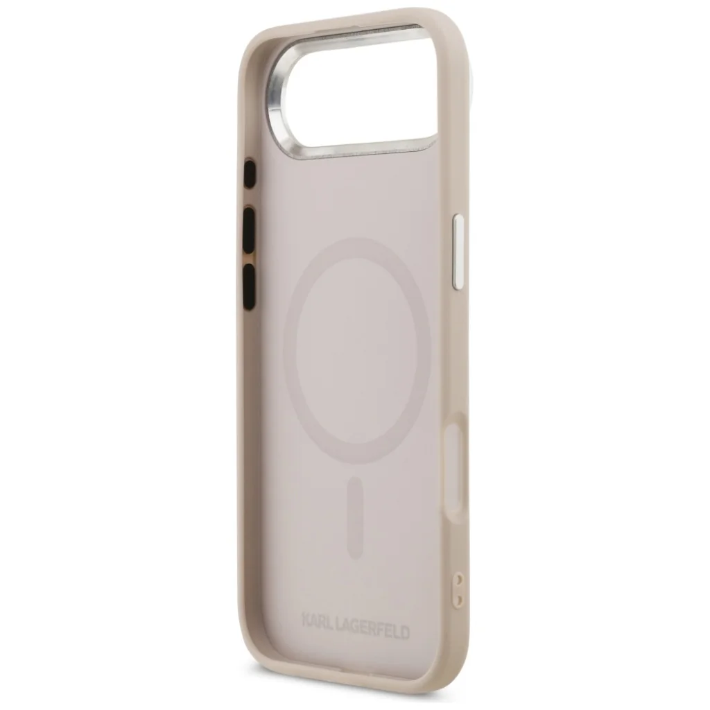 A tok lenyűgöző rózsaszín árnyalatban pompázik, mely elegáns és kifinomult megjelenést kölcsönöz készülékednek. A hátlapon a háromdimenziós, fémhatású Karl Lagerfeld és Choupette karakterek kiemelkedő részletgazdagsággal díszítik a tokot, egyediséget és játékos eleganciát adva. A MagSafe gyűrű körül diszkréten, körkörösen elhelyezett "KARL LAGERFELD" felirat tovább erősíti a márka azonosíthatóságát, míg a kamera körüli ezüstszínű keret modern és letisztult hatást kelt.