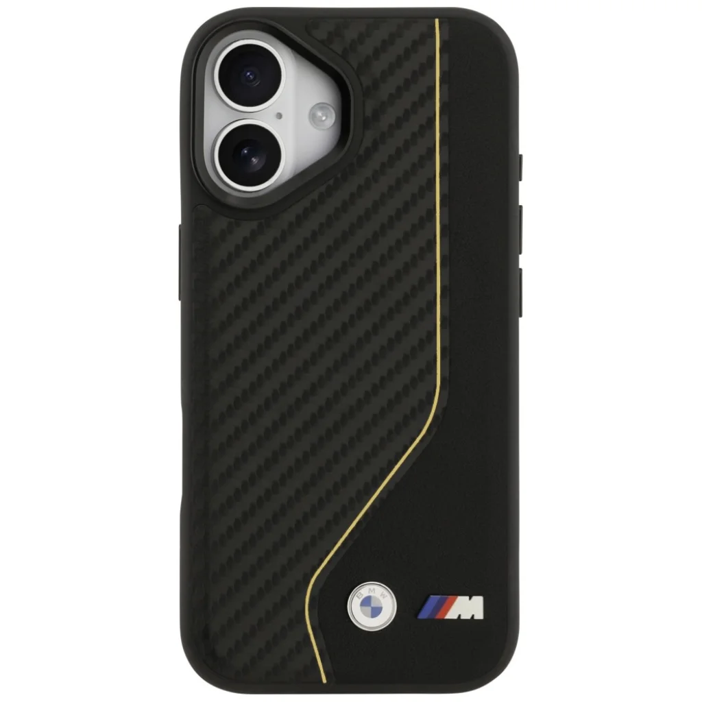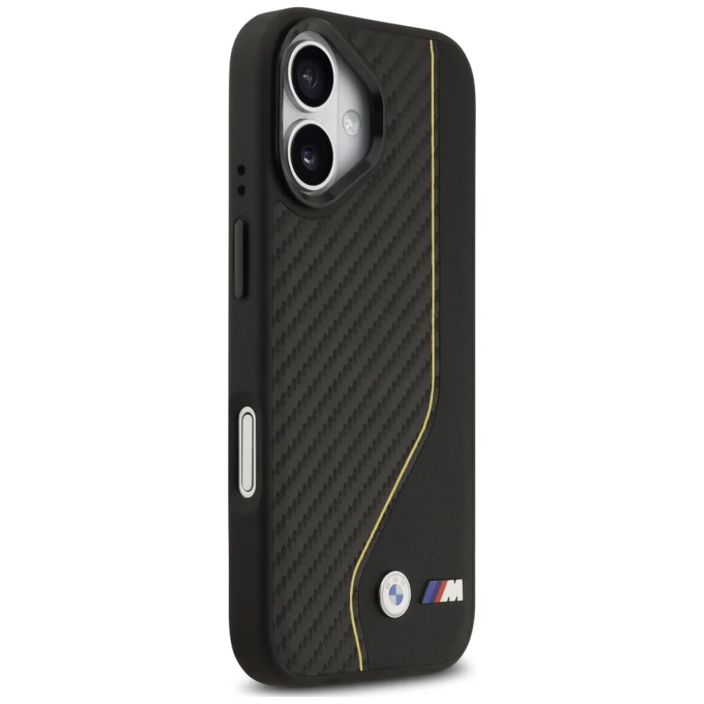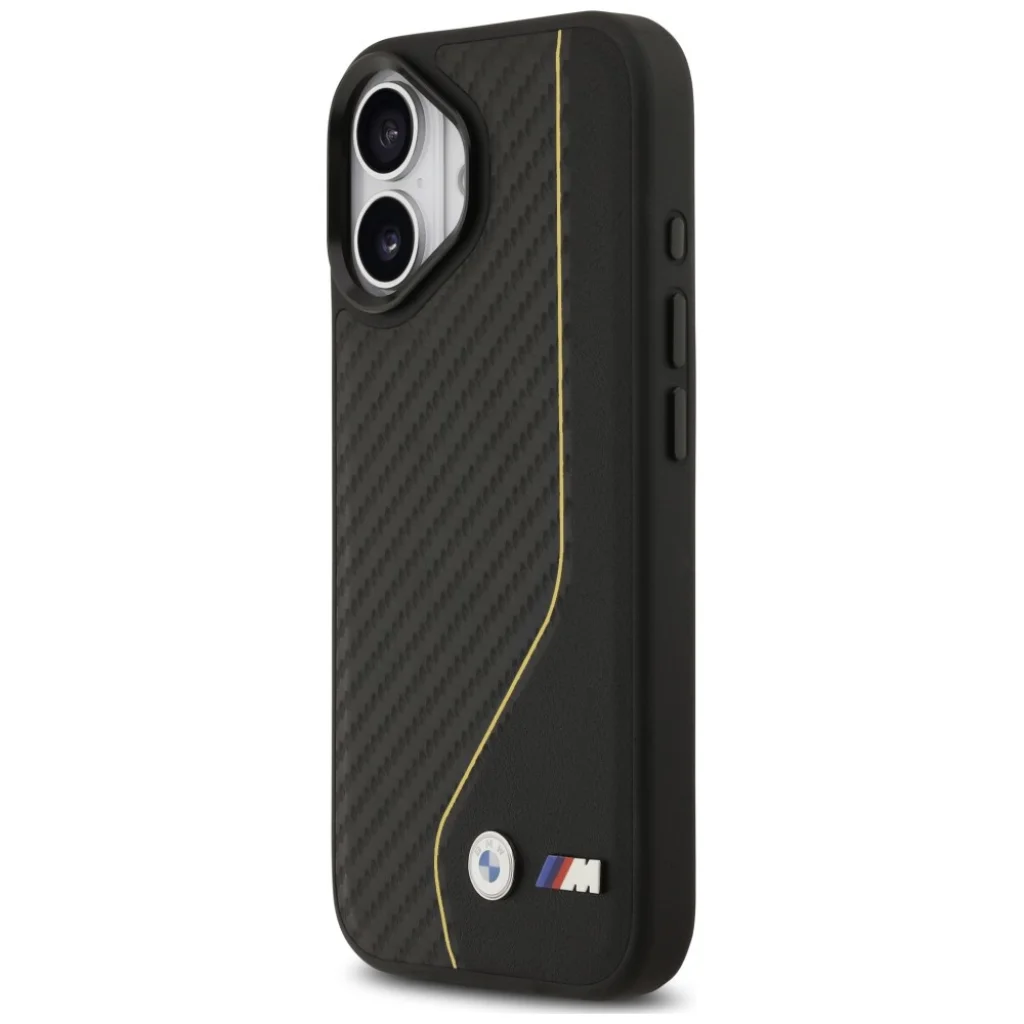Az M Carbon Line & Logo tok az ellenállóságot sportos megjelenéssel ötvözi. Felületét ökobőr és karbonmintás bevonat kombinációja borítja, amelyet a BMW M stílusa ihlette kontrasztos sárga csík egészít ki. A tokot fém BMW logó díszíti, amely kiemeli a termék eredetiségét és prémium jellegét. A kamerakeret és a gombok fekete színű kialakítást kaptak, így a tok elegáns és egységes megjelenést biztosít.