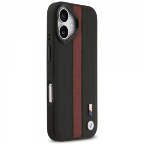 - Ikonikus BMW M stílus: A tok mélyfekete alapszínét egy lenyűgöző, perforált piros csík szeli ketté, amely a BMW M autók belső terét idézi, dinamikus és sportos megjelenést kölcsönözve.