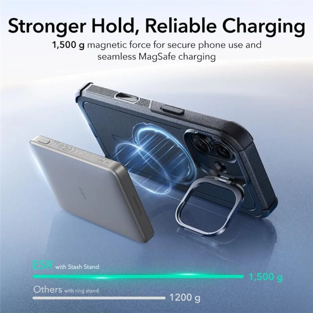 Az integrált mágneses gyűrű **MagSafe technológiával** kivételesen erős tapadást kínál. Az 1500 grammos mágneses erő stabil és biztonságos kapcsolatot biztosít a MagSafe kompatibilis töltőkkel és kiegészítőkkel – elmozdulás, leválasztás vagy a töltés hatékonyságának elvesztése nélkül. Ez messze felülmúlja a hagyományos gyűrűs állványokkal szerelt tokok 1200 grammos átlagát, garantálva a megbízható és gyors vezeték nélküli töltést.