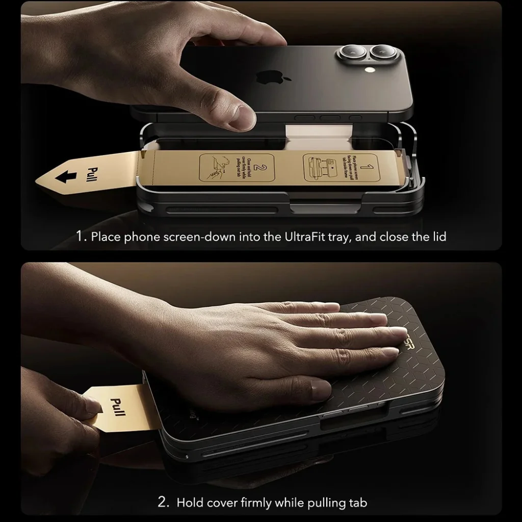 Felejtse el a bonyolult és frusztráló felhelyezést! Az ESR innovatív UltraFit kerete és az intelligens "Pull" fül lehetővé teszi a por- és buborékmentes felhelyezést mindössze néhány másodperc alatt. Egyszerűen helyezze a telefont a keretbe, zárja le a fedelet, és húzza meg a fület a tökéletes, precíz illeszkedésért – minden alkalommal. A teljesen pormentes és buborékmentes élmény garantált.