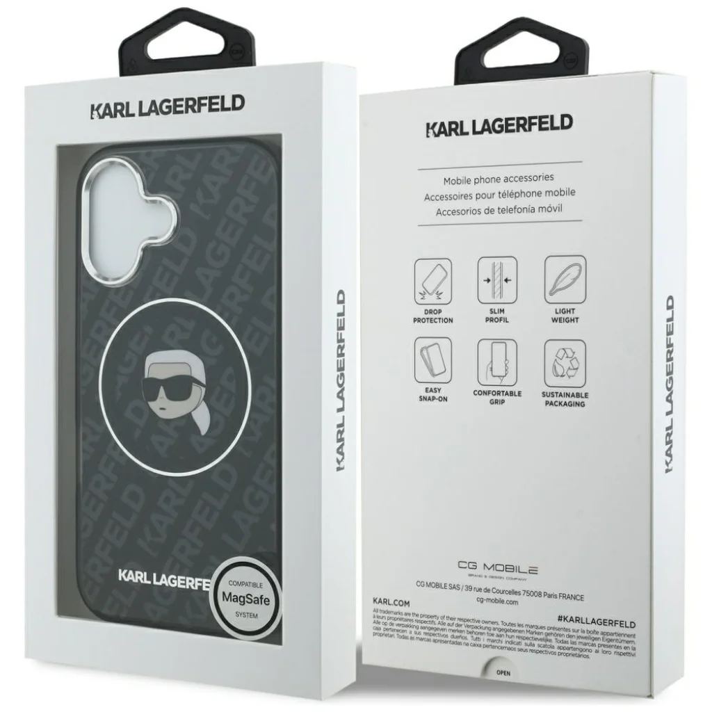 Az IML Karl Head Logo MagSafe sorozat azoknak kínál ideális megoldást, akik a funkcionalitás és a kivételes stílus harmóniájára vágynak okostelefonjuk esetében. Ez az egyedülálló kollekció nemcsak a készülék biztonságát garantálja, hanem különleges karaktert is kölcsönöz, egyedi dizájnjával vonzza a tekinteteket. Az összes MagSafe technológiával rendelkező készülék tulajdonosa számára ideális választás. A tok magas minőségű anyagokból készül, nemcsak stílusos, hanem tartós és kopásálló is. A sorozat kiemelkedik egyedi IML grafikájával, amely az ikonikus tervező, Karl Lagerfeld hasonmását ábrázolja. A márka logója, amely az egész tokon és alján is megjelenik, nemcsak eleganciát kölcsönöz a tokoknak, hanem a hitelességet és a kiváló minőséget is szimbolizálja. A tok hatékonyan védi a készüléket az ütések ellen, elnyeli a sokkokat, ezáltal növeli a telefon biztonságát. Enyhén kiemelkedő szélei vannak, amelyek megvédik a képernyőt és a kamera lencsét a karcolásoktól vagy töréstől. A tok tökéletesen illeszkedik, teljes gombborításokkal és pontos kivágásokkal a portok számára. A tok mágneses gyűrűvel van felszerelve, amely kompatibilis a MagSafe vezeték nélküli töltővel, biztosítva a gyors és egyszerű töltést. A tokba épített mágnesek tökéletesen illeszkednek a készülékhez, és biztosítják az iPhone erős rögzítését a MagSafe töltőhöz. A tok a Karl Lagerfeld márka engedélyével készült.